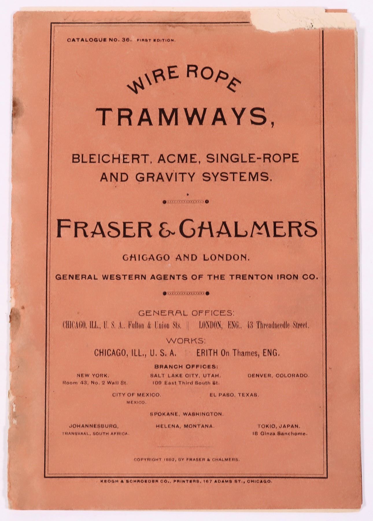 Fraser & Chalmers Wire Rope Tramways catalog. Undated, 18pp. Illustrations of tramways as would be used with mining buckets. Page chips, torn spine, staple stains etc. Please inspect.