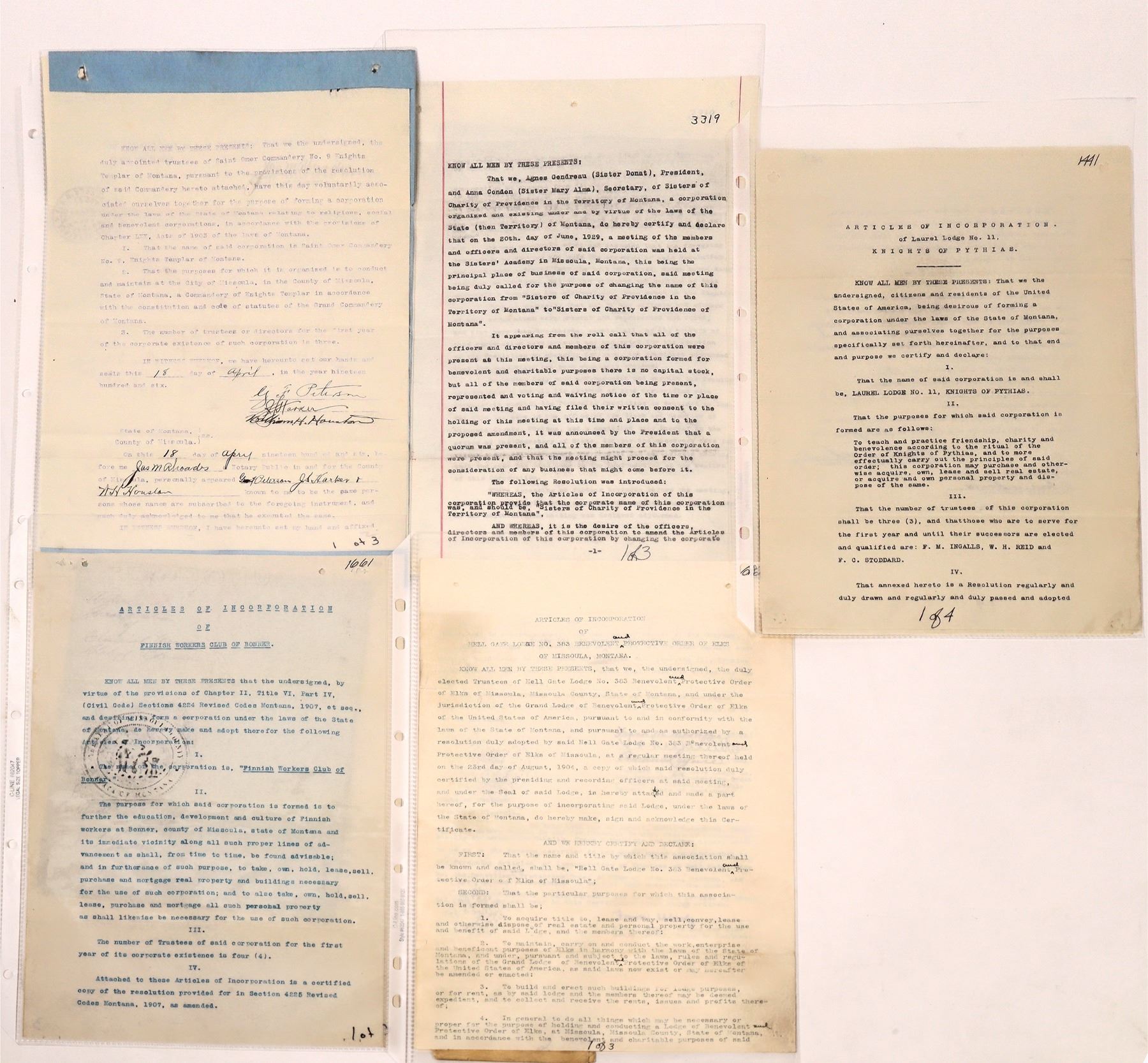 5 articles of incorporation and reports from fraternal groups. Hell Gate Lodge #383 Benevolent and Protective Order of Elks of Missoula 1904. Finnish Workers Club of Bonner 1914. Sisters of Charity of Providence 1929. St. Omer Commandery #9 Knights Templar of Montana 1906. Laurel Lodge #11 Knights of Pythias 1912. Montana Missoula