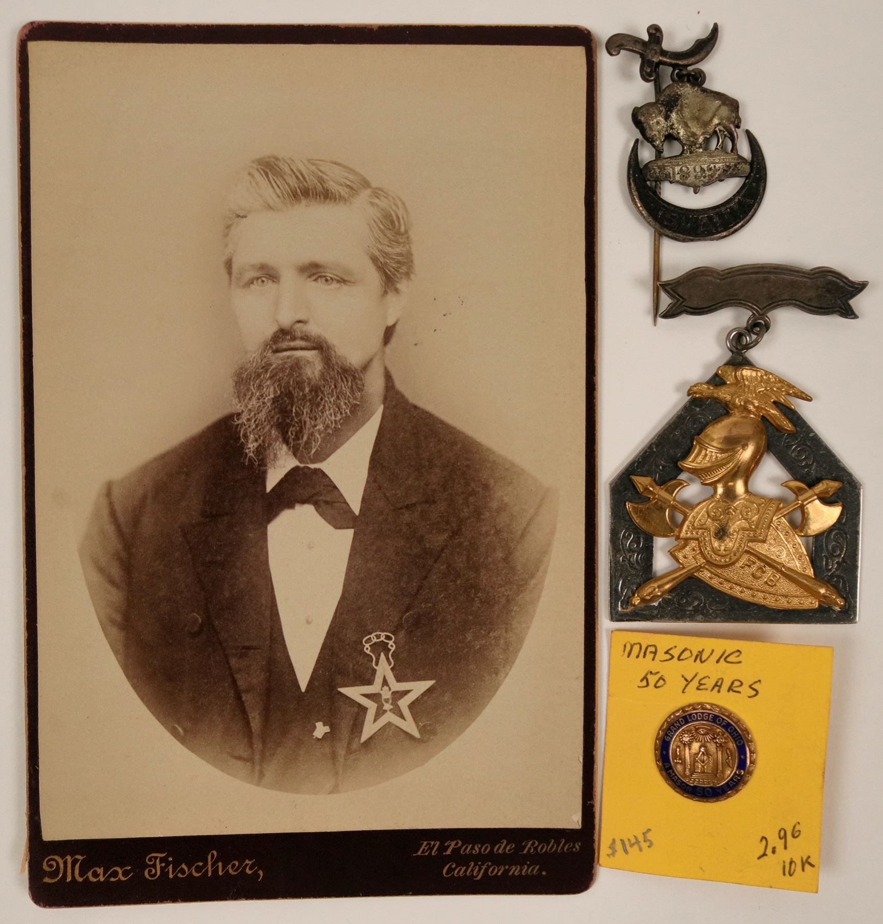 Group of three items related to U.S. fraternal groups, c1874-1899. Includes mounted photograph of a man wearing a large star shaped masonic badge on his breast. In gold writing below is printed, "Max Fischer, El Paso de Robles, California. Also includes an Odd Fellows badge, with a dagger and buffalo, and the inscribed with, "SMAILYA," and "1899," and a Knights of Pythias badge with gold plate and silver, inscribed "S.S. Davis, Supreme Lodge, copyright 1874."