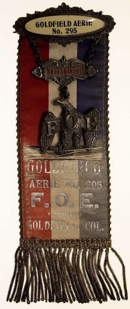 Fraternal Order of Eagles (F.O.E.) Aerie No. 295 Badge, c.1900. The badge has red, white and blue stripes with metal tassels at bottom. Printed on the striped cloth is Goldfield, Aerie NO. 295, F.O.E., Goldfield, Col. At the top of the ribbon is the metal pinback with white celluloid with Goldfield Aerie No. 295. Hanging from here is a elongate metal with Member with red print and hanging from this piece is a spread winged eagle with F.O.E. in relief. Measures 3" x 8".