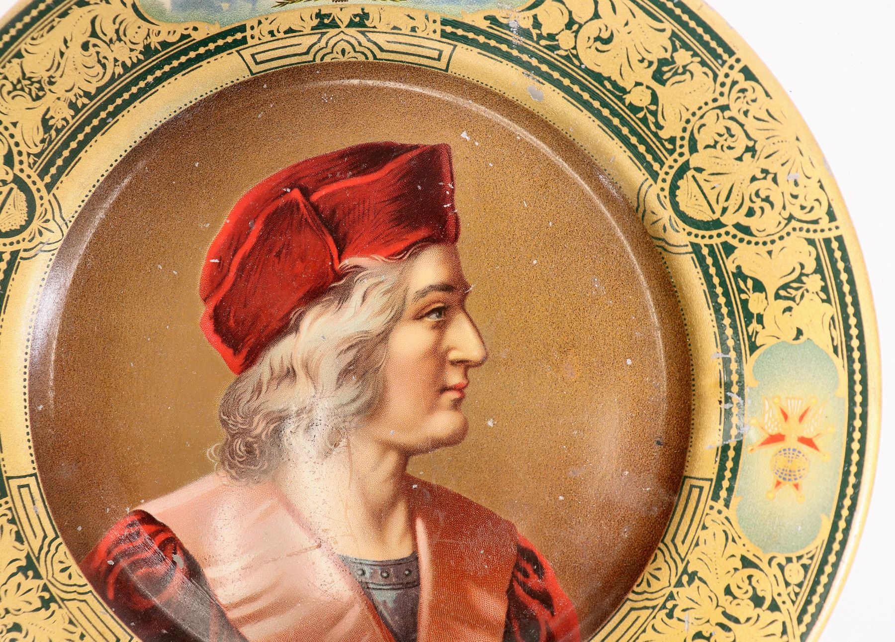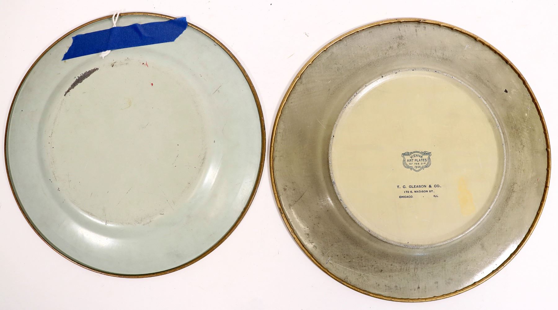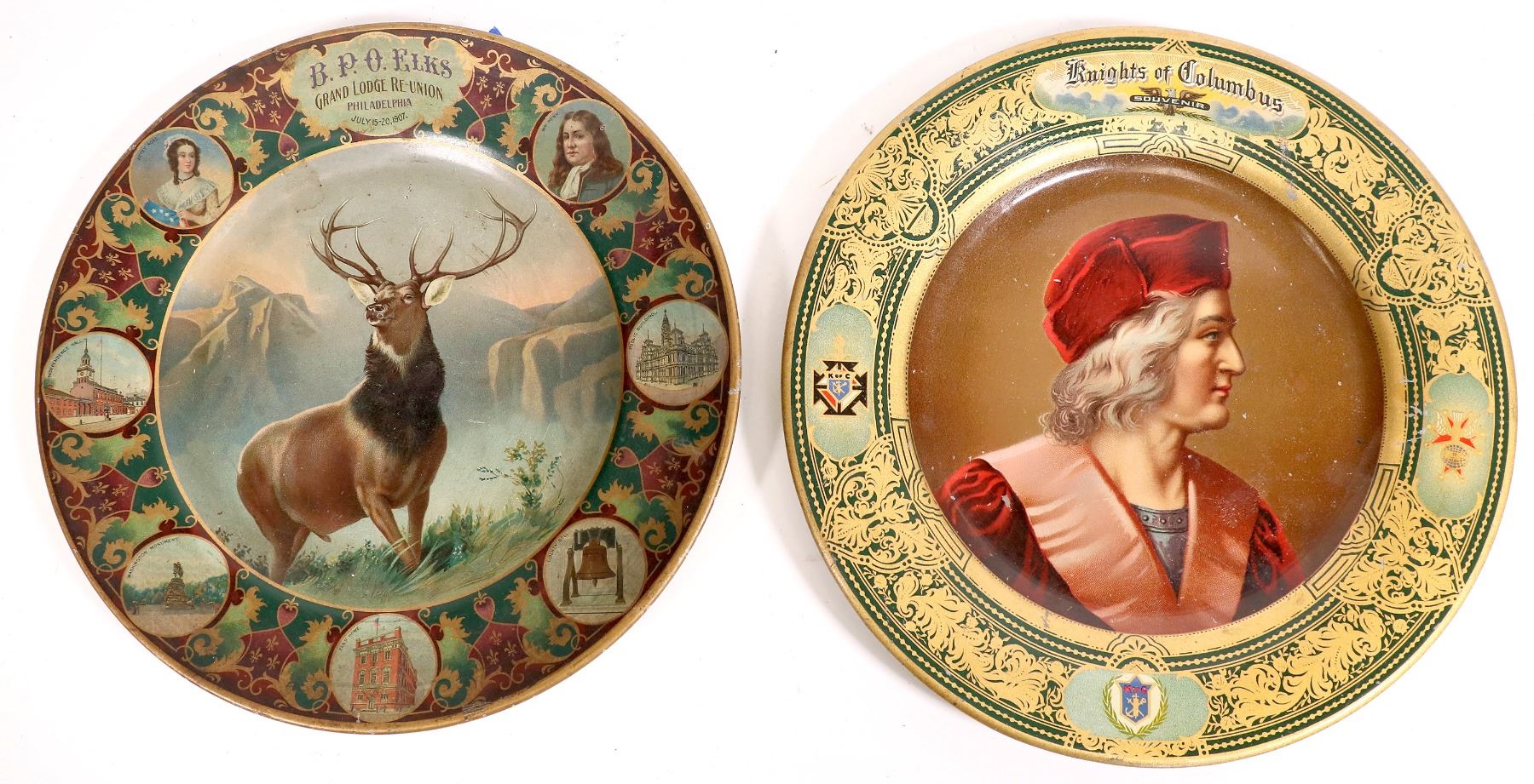 This lotr has two beer trays single service: "Knights of Columbus/ souvenir" with the likeness of Christopher Columbus in the base, outlined with gold trim. "Vienna Art Plate/ pat. Feb/. 21st, 1905/ T.C. Gleason & Co./ Chicago, Ill." 10 in. across, very good condition. pre-pro. The second tray is marked "B.P.O. Elks/ Grand Lodge Re-Union Philadelphia/ July 15-20, 1907" at 9. 5in. The border has images of Independence. Pre-pro. Minor surface scratches. c.1905