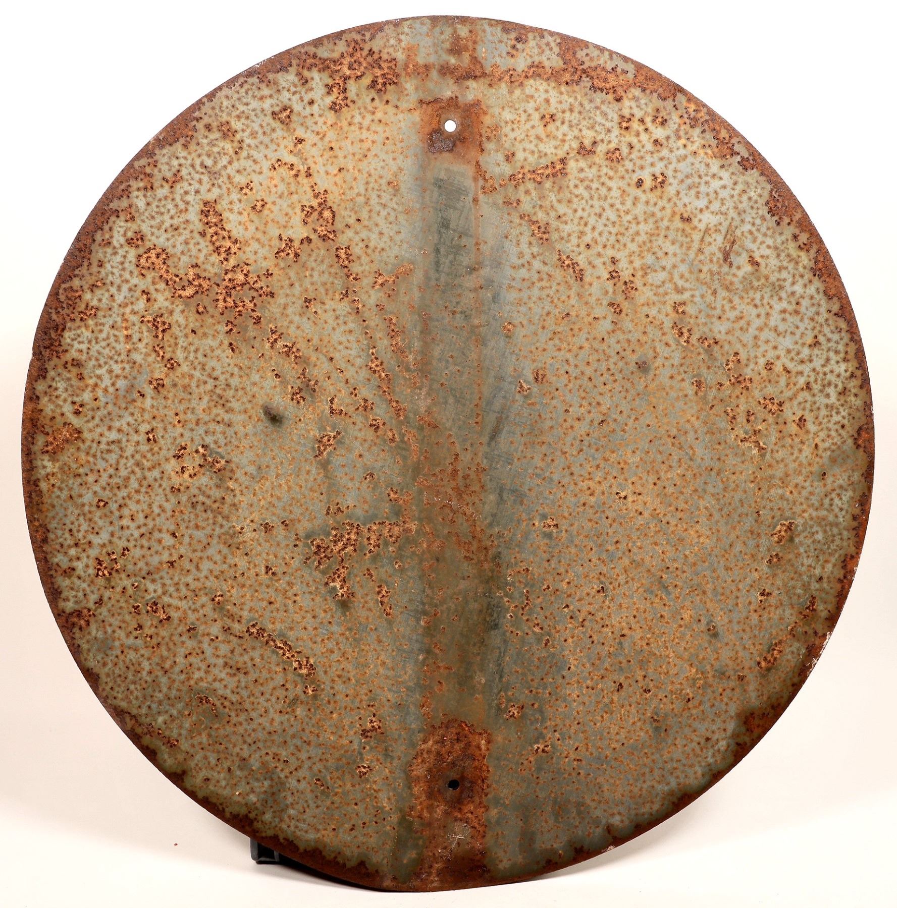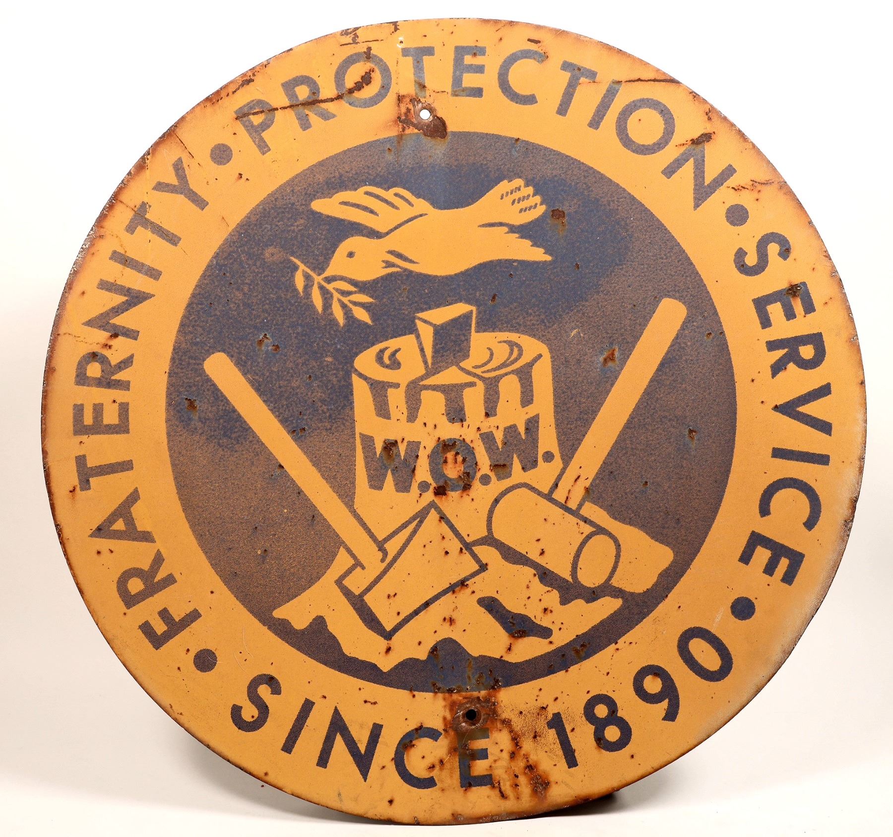 A 30" diameter metal sign for Fraternity Protection Insurance Company. The yellow and blue sign has rust areas, but no bullet holes. Please see photos for more details.