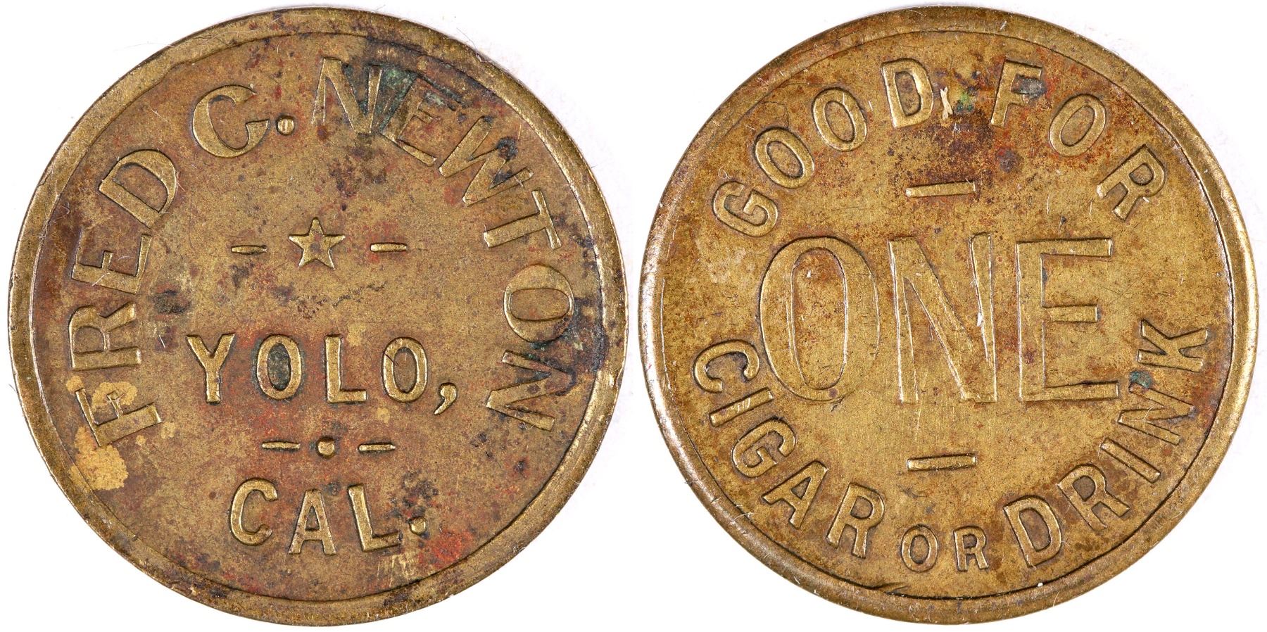 FRED C. NEWTON / YOLO, / CAL. // GOOD FOR / ONE / CIGAR OR DRINK; Br rd, 21 mm. Ex: Ron Lerch collection.