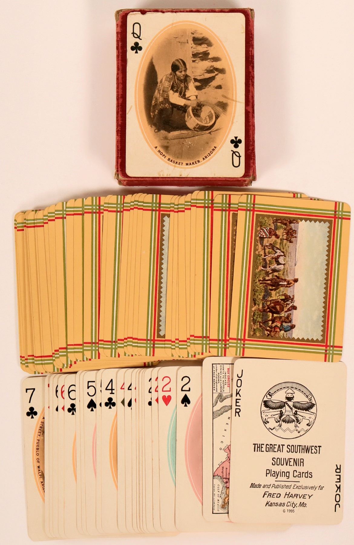 This is a deck of cards issued by Fred Harvey as souvenir cards with images of the Great Southwest. Like new condition with carrying box. C.1920's.