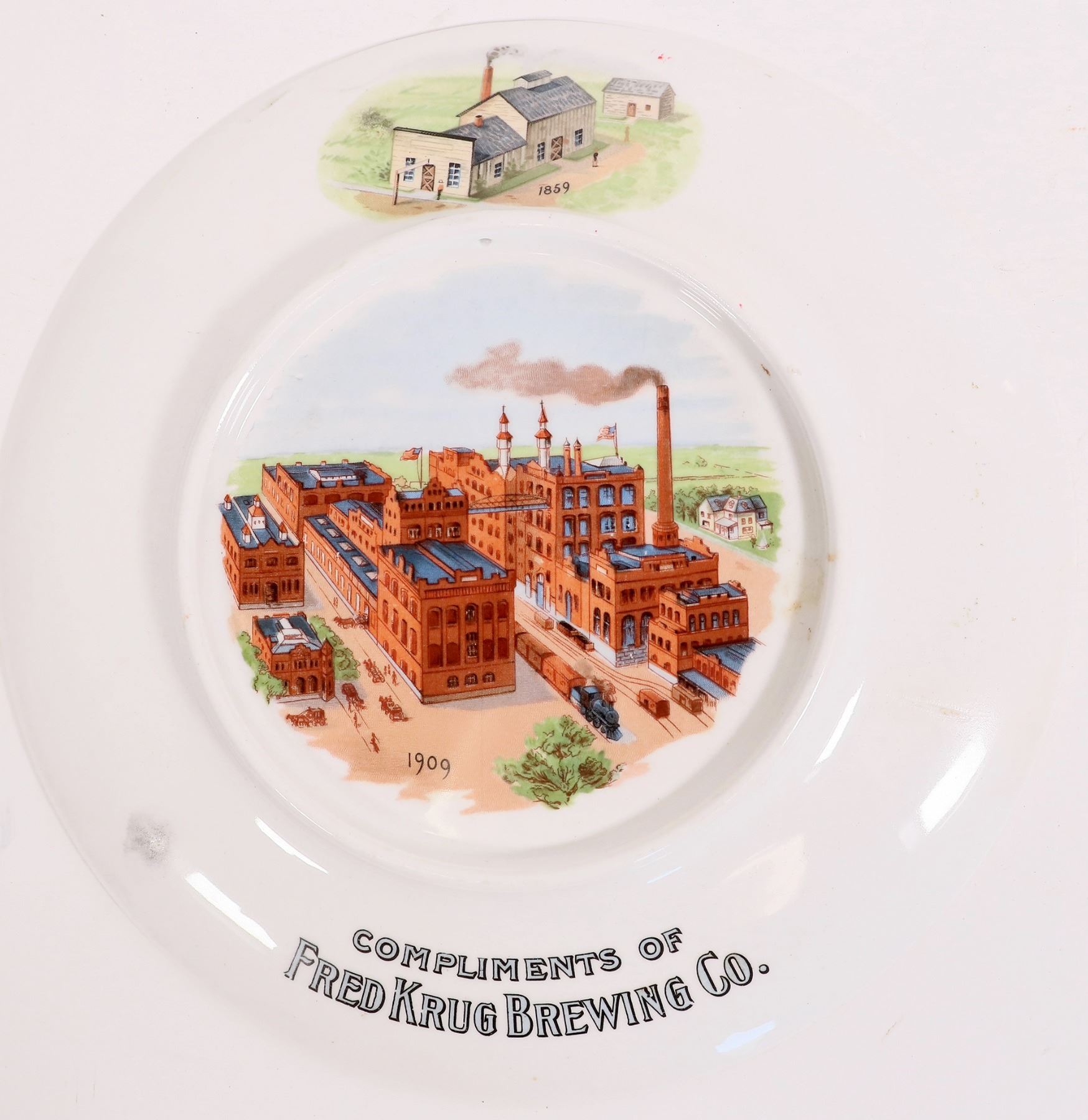 This is a 50th anniversary beer tray/plate "compliments the Fred Krug Brewing Co." of Omaha, Nebraska. 1859-1909. It has the likeness of Fred Krug the founder in the center with a border of hops, gold trim. 10 in. The back has renderings of the original building as it looked in 1859 to the current buildings of 1909. Very good condition. Omaha Nebraska c. 1909