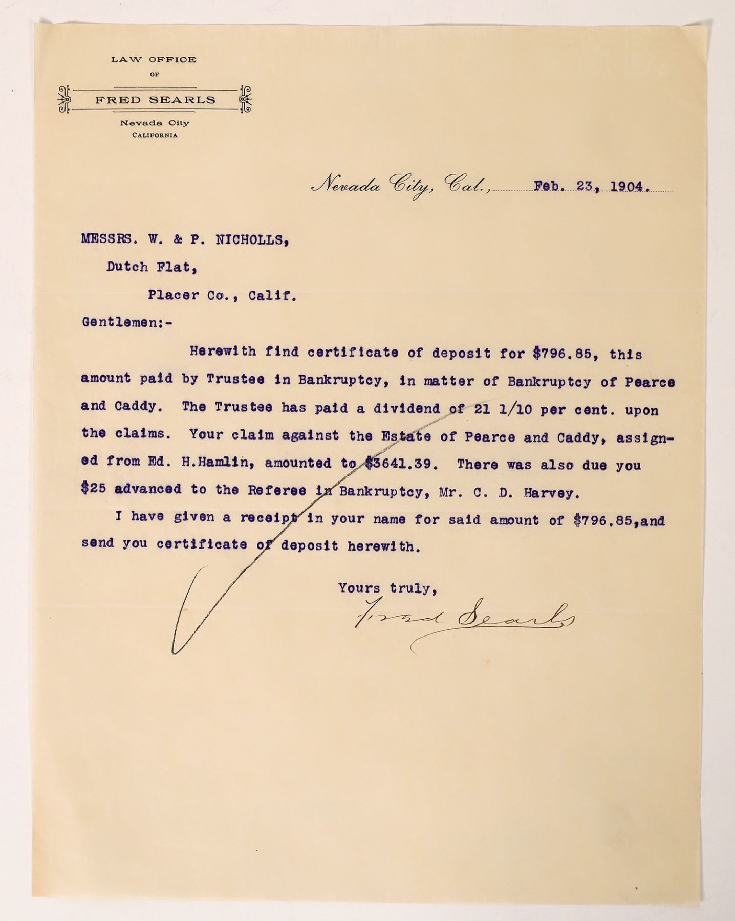 A letter from Attorney Fred Searls of Nevada City, father of Fred Searls Jr. one of the prominent geologists and mining experts of the mid 1900s. Please see photos for more details. California Nevada City 1904