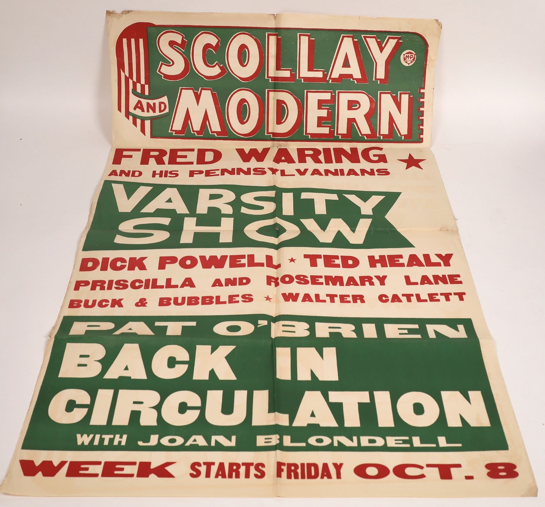 During this period his band was the hottest band in America. Here the broadside is advertising Dick Powell, Ted Haley, Priscilla and Rosemary Lane, and others. 29" x 45" Reasonably good condition, folded, very colorful show piece!
