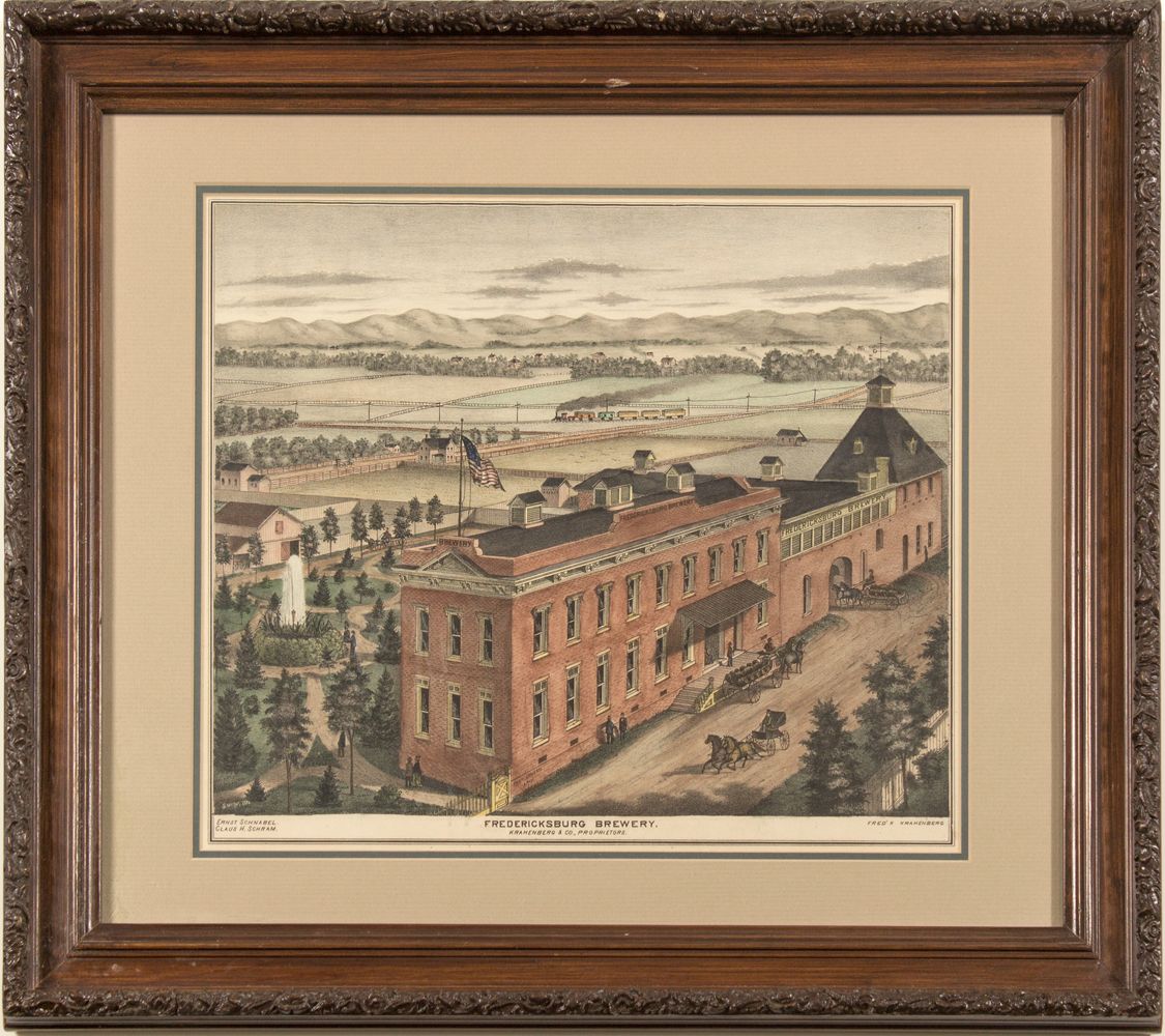 Hand-colored. Caption on the bottom: Fredericksburg Brewery, Krahenburg & Co., Proprietors. Lists Ernst Schnabel, Claus H Schram, and Fred'k Krahenurg. This lithograph was taken out of Thompson & West's 1876 Santa Clara County atlas. It shows the brewery, a red brick building, with wagons full of barrels in the front. Well-dressed people are walking next to a fountain behind the brewery. A train moves in the background, and in the far distance are houses and rolling hills. The artist is Smith, Del. The lithograph measures 15" x 12" in a 23" x 19 1/2" frame. Burt Collection