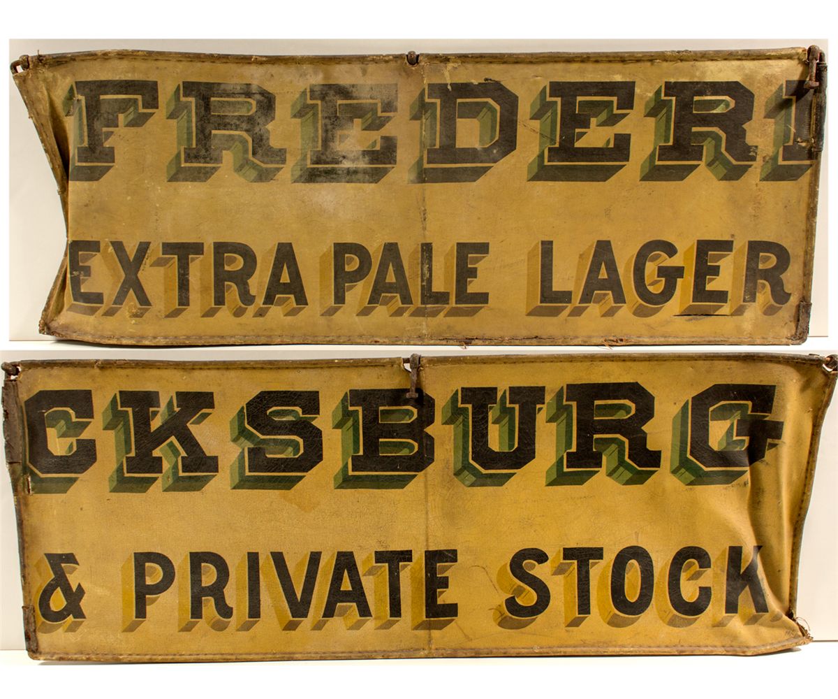 Super rare. Only two sets of these are known by Tom: one for Wieland and this one for Fredericksburg. Tom verified that these were beer wagon sides when he found an early photograph showing wagons with identical signs. Each side measures 60" x 22.5." Black lettering and yellow background: "Fredericksburg/ Extra Pale Lager & Private Stock."