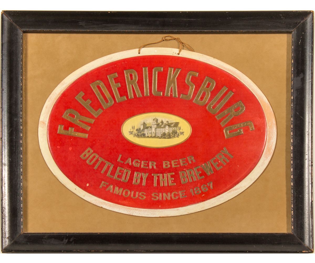 Oval shaped. Red with gold lettering. "Bottled by the Brewery since 1867." Lithograph of the brewery in the center. Measures 16 1/2" x 12" in a 21" x 18" frame. The brewery was located on The Alameda at Cinnabar Street. Burt Collection