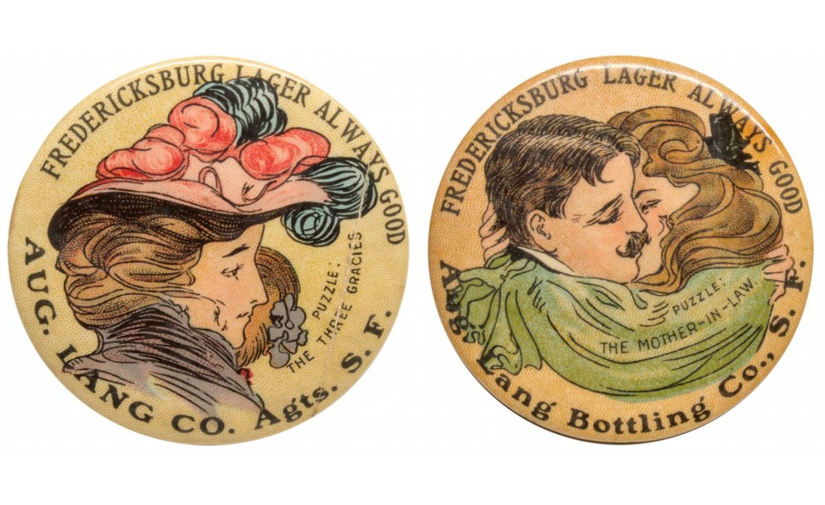 Wonderful set of "puzzles." 1) "Fredericksburg lager / Always Good / Aug. Lang co. / Agts. S. F." Shows man and woman kissing. "The Mother-in-Law." 2) Second mirror shows a woman's face and is titled "The Three Gracies." Burt Collection