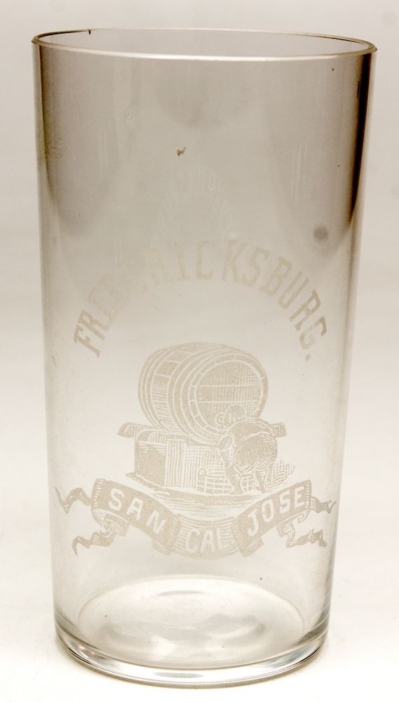 Etched. Fredericksburg barrel front and center. 4". One bubble near top. "Fredericksburg. / San Cal. Jose." Burt Collection