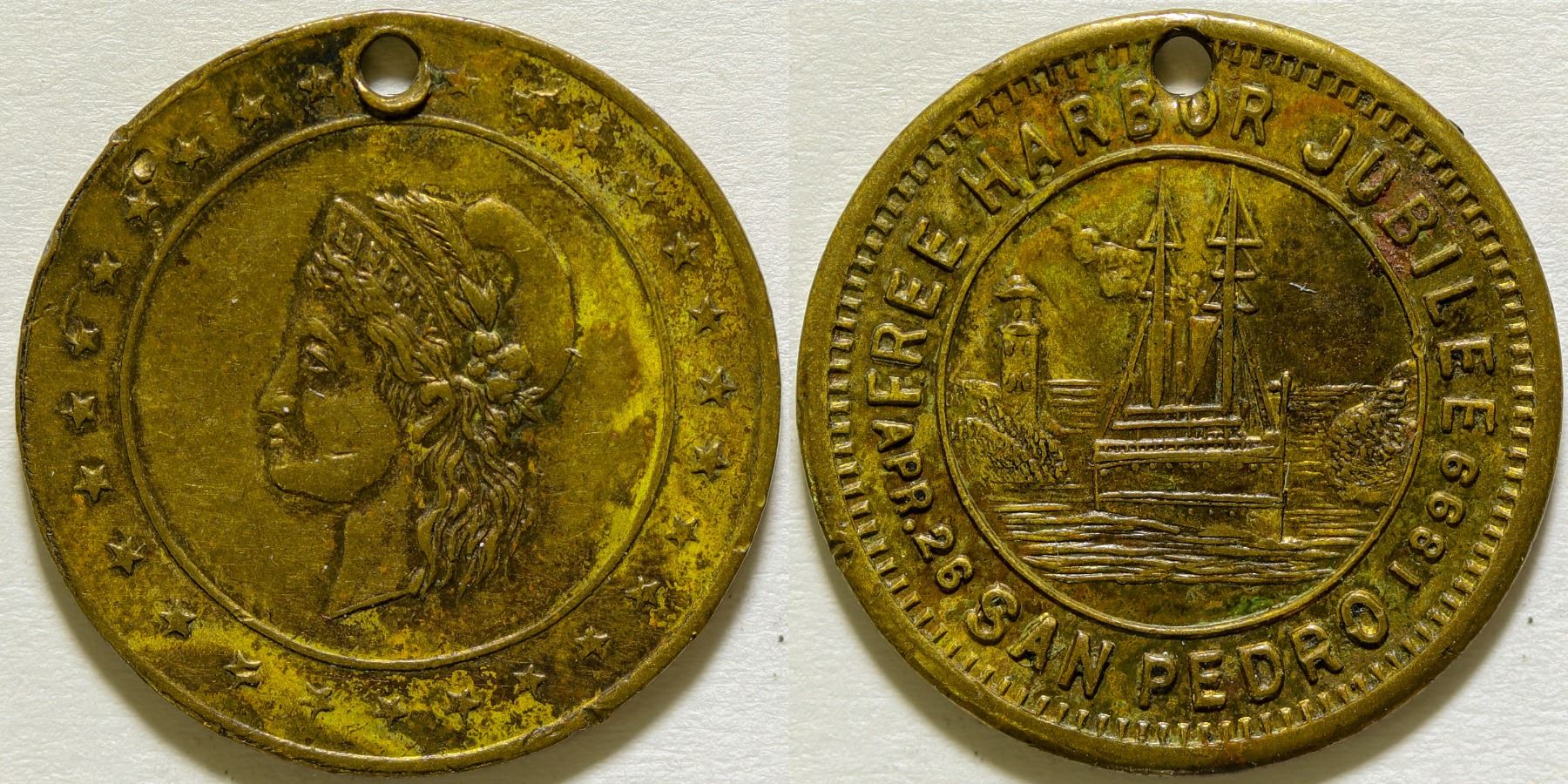 First one we've had, we argue this piece qualifies as a so-called dollar in $1 gold coin size. Br. rd., 18 mm, holed. From the L. B. Fauver Collection.