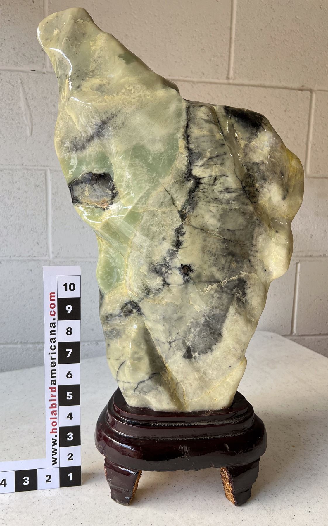 Chinese viewing stone made of highly metamorphosed sediments with a striking contrast between white, black, and green tones. Approx 20 inches tall and 10 inches across with an attractive appearance on every side. Comes with a custom-carved wooden base. China Chunlin Zhu Collection