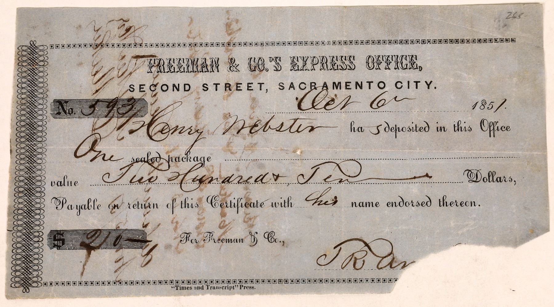 October 6th, 1851, Henry Webster deposited one sealed package valued two hundred ten dollars and Freeman & Co's Express Office on Second Street, Sacramento City issued this receipt. Printed by Times and Transcript Press, 8 x 4 1/2 inches, torn lower right corner makes signature illegible. "John M Freeman bought out T.R. Hawley's interest in Hawley's Express on November 11, 1850. The route was between Sacramento City and San Francisco by steamboat with further steamboat service to river offices north to Marysville. Adams Express operated as Freeman's agent and expediter in San Francisco. The express served as a trunk line connecting at Sacramento with Bower's Express for service to Nevada City and with Langton's Express for service to Downieville. After his purchase of Mumby's Express in June 1851, Freeman sold out to Adams & Co on November 8, 1851. After serving as an agent for Adams & Co for several years, he started a new Freeman's Express after Adam's failure in February 1855.": California Private Mails 1849 to 1856 by Richard Frajola.