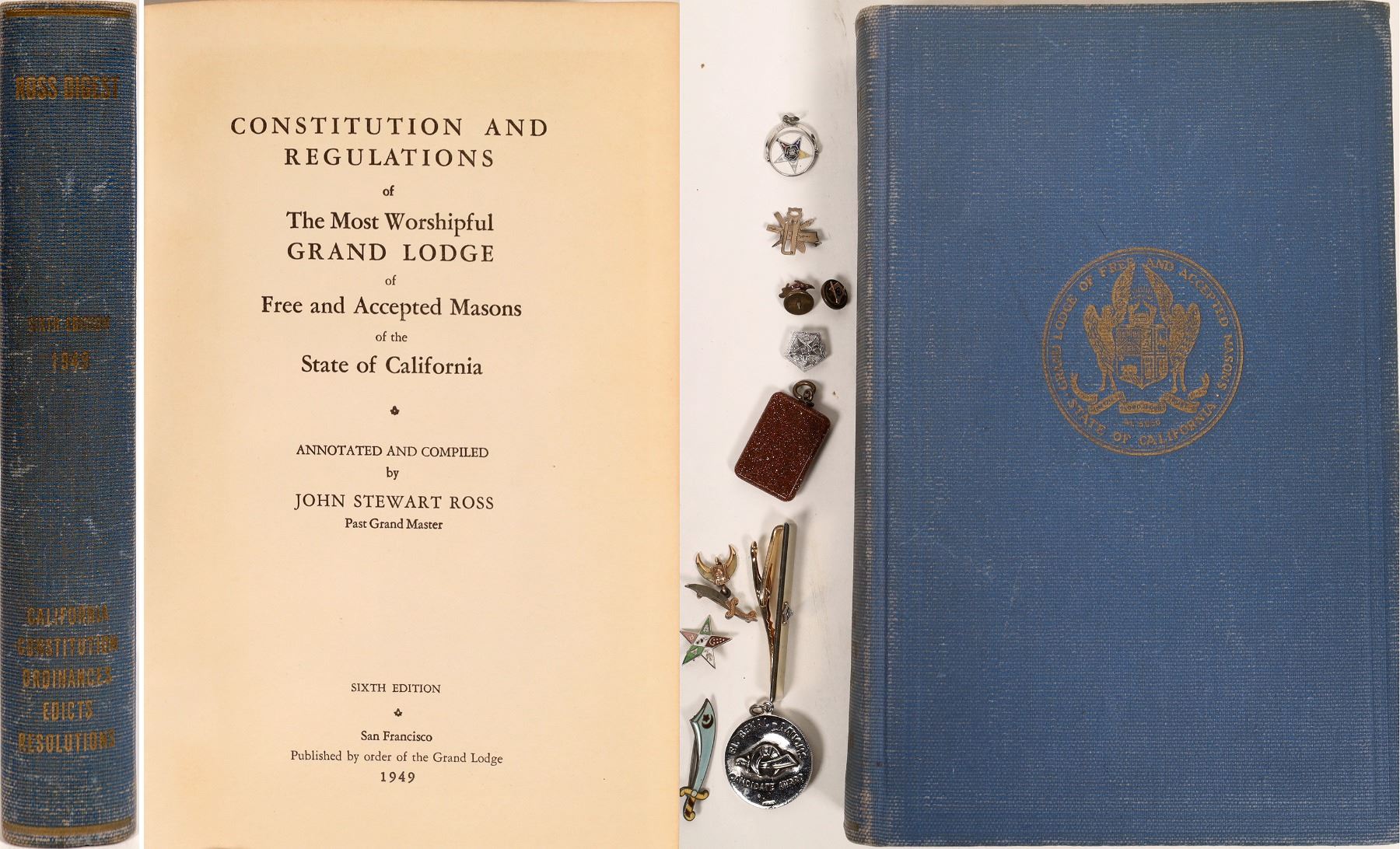 Grand Lodge of Free and Accepted Masons. State of California. Annotated and Compiled by John Stewart Ross. Sixth Edition; Published by order of the Grand Lodge, San Francisco; 1949. Includes bag of 11 various pins different colors and shapes. Great for any collector of fraternal pins.