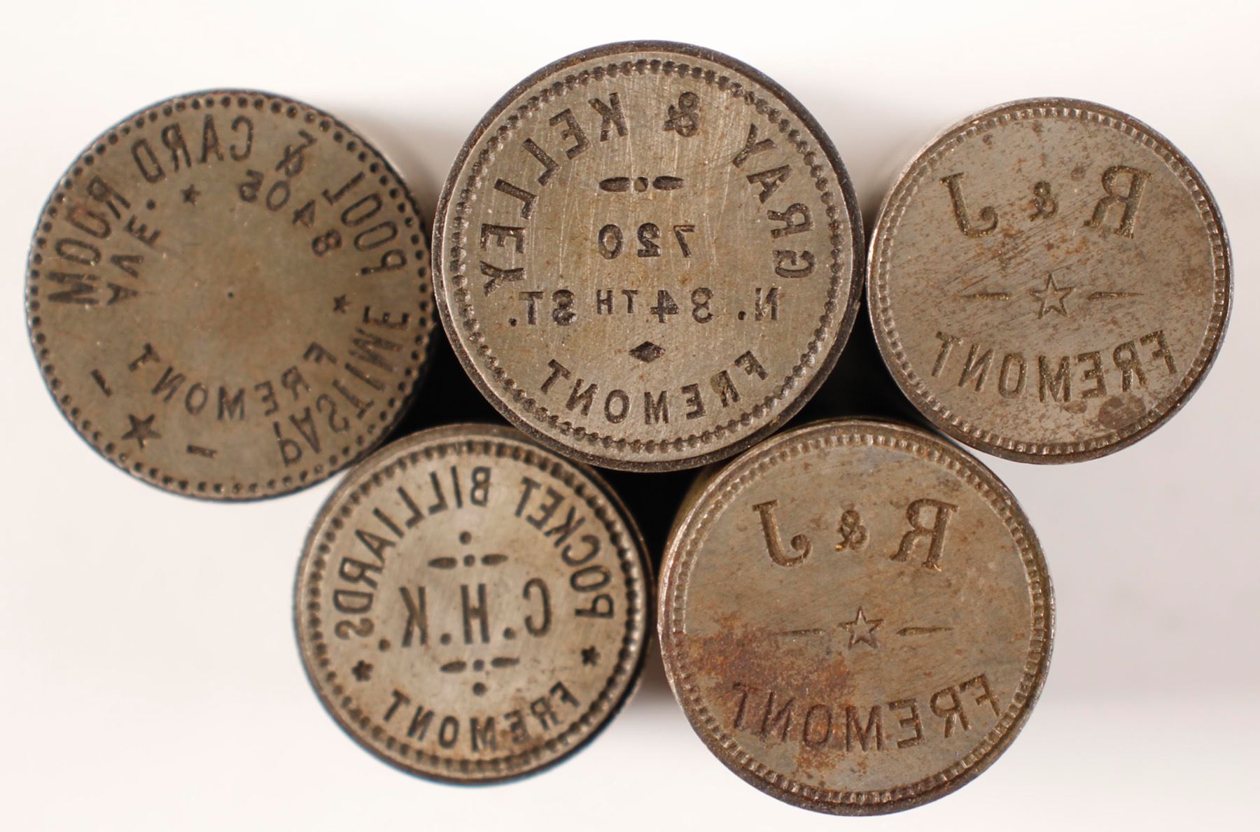 5 token dies self identified from Fremont, WA. 19mm: R & L, CHK Pocket Billiards. 21mm: R&J. 24mm: Pastime Pool & Card Room, Gray & Kelly. Northwest Territorial Mint Historical Token Die Collection State: Washington City: Fremont Date: c1903-1950 HWAC# 85064