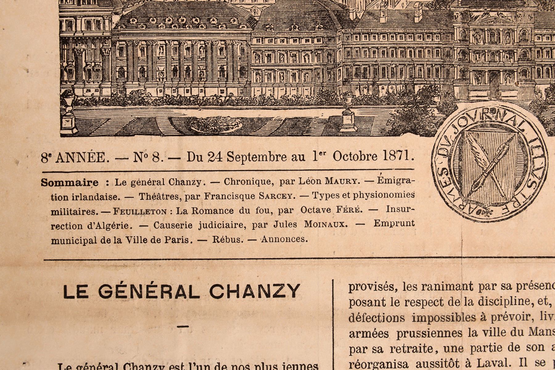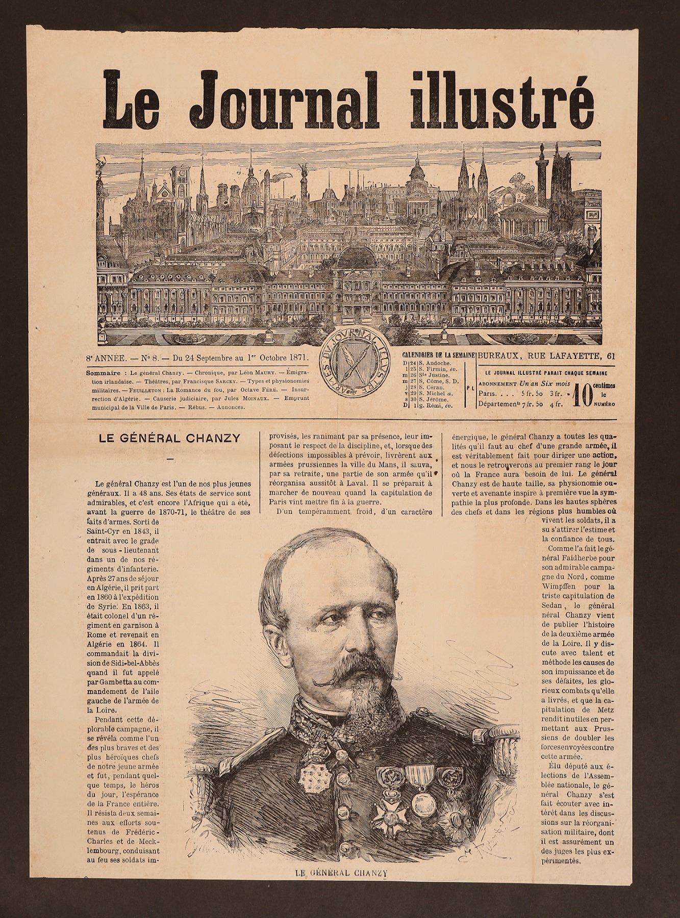 October 1871 issue of French newspaper, Le Journal Illustre featuring French Army General Chanzy. The good General lead troops during the Franco-Prussian war Jul 19, 1870 ñ May 10, 1871. Unfortunately for Chanzy & France lost allowing unification of Prussia into Germany & the rest is history. Page measures 10"x 14". Ready for framing & hanging. Please see photos for more details.[ France