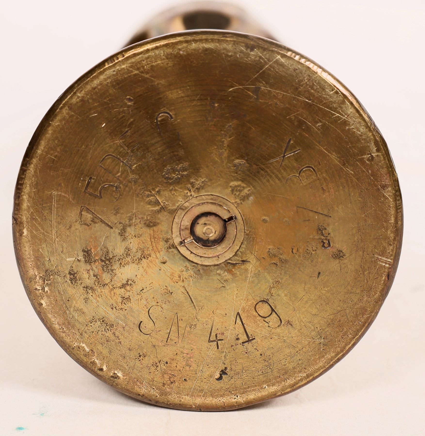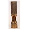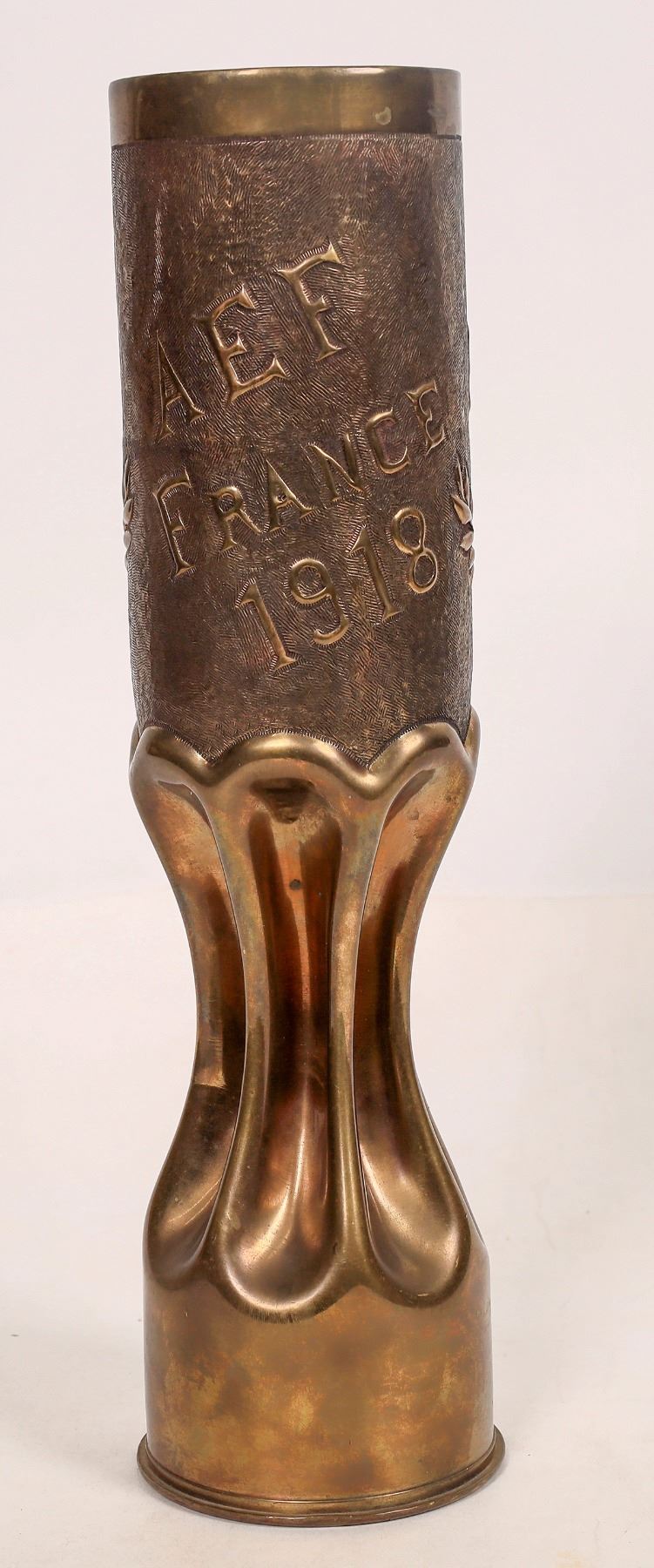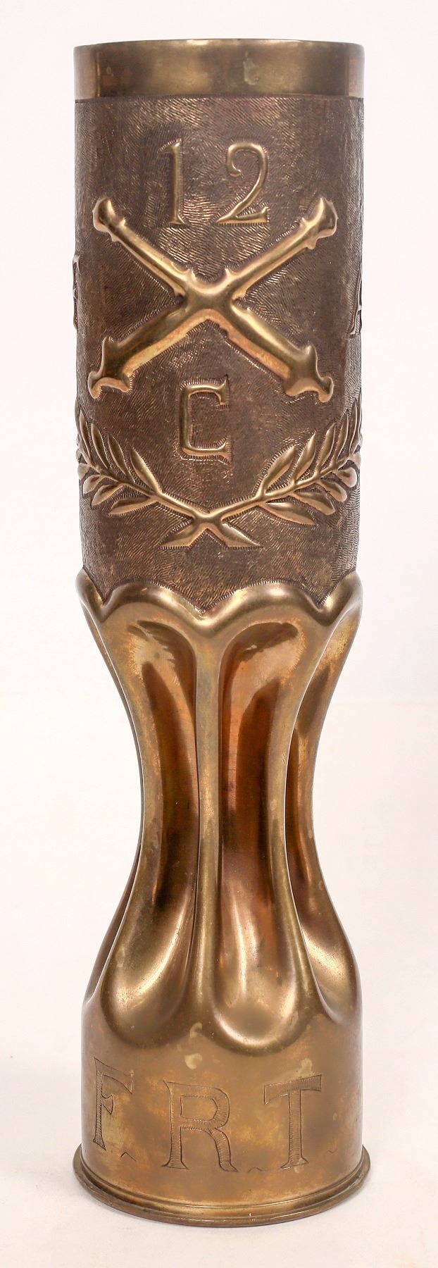 A nice example of Trench Art from France during World War I. The designations in raised relief of the AEF (American Expeditionary Forces) commanded by General John J. Pershing and The 12th Field Artillery Company. Also in raised relief are olive branches and the crossed cannons common for artillery companies. The shell is marked 75 DEC (de Campagne) and stands 12.5" tall by three inches wide. A beautiful piece as well as historic. Please see photos for more details