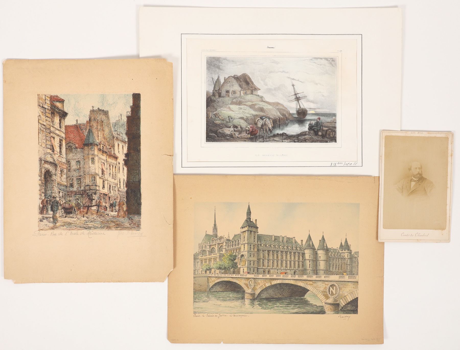 Collection of 4 includes art lithographs (3) and a cabinet card from France, c1800s. Artwork includes a pen and ink cityscape of a Parisian neighborhood, pencil signed by artist, Geo Dunoy, on dark ivory paper, 9.75" x 12.5" with illusion of a mat, chips and tears (two up to 1") around edges. Also a print by French artist Barday, pencil signed by artist, pen and ink of the Palais de Justice in Paris, on dark ivory paper 12.5" x 9.75" with illusion of a mat, chips and three .5" tears around edges, printed in France, 1943; and a pen and ink lithograph titled "La Maree Basse," pencil signed XIX em Siccle? 10.5" x 7.75" with illusion of mat, no rips or tears. Also a cabinet card of Comte de Chambord, French royalty, last heir house of Bourbon.