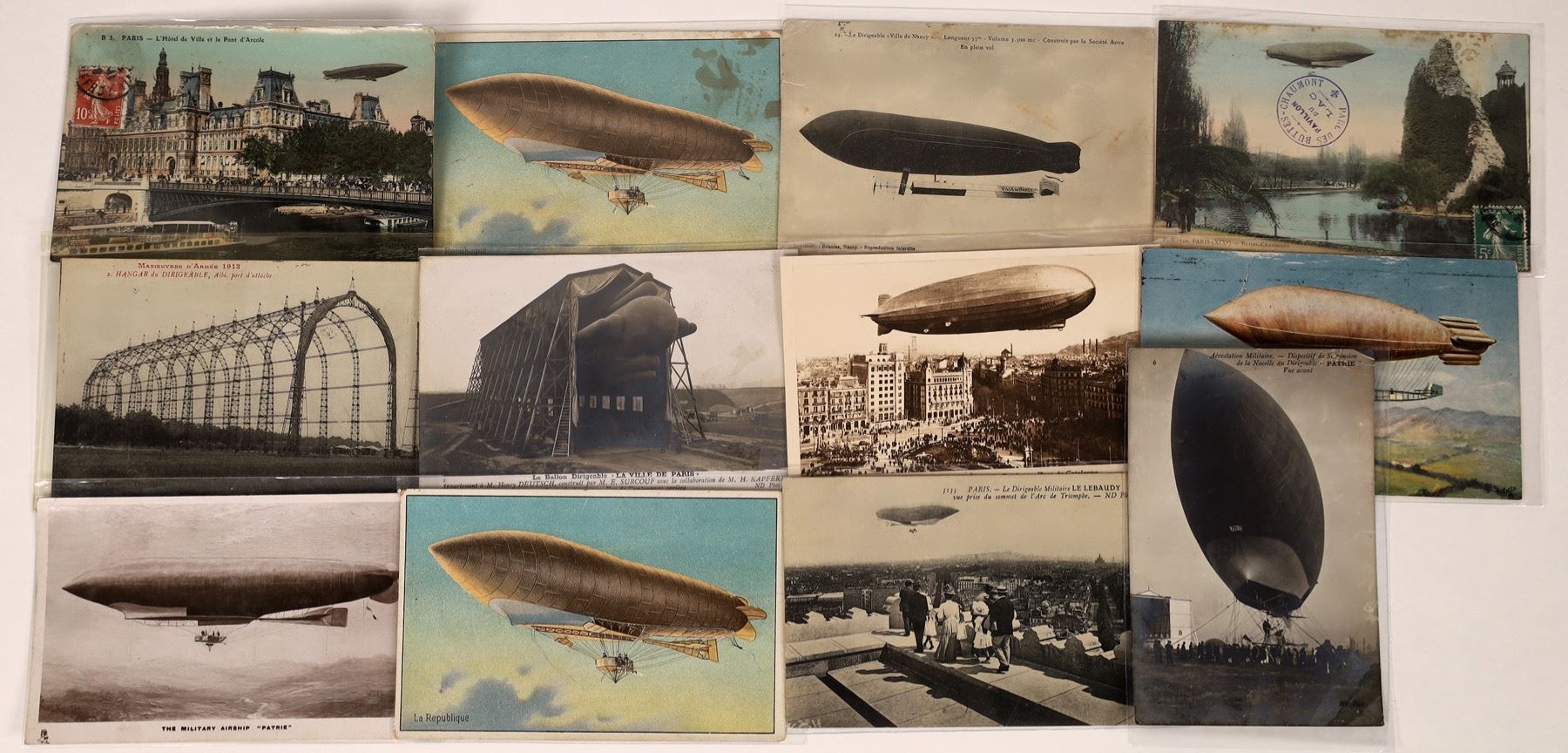 Lot of 12. Seven are postmarked w/ stamps (10 cents). Three are Tuck’s cards. One 1907 RPC and possible two more.. Includes: Graf Zeppelin over Barcelona. “La Valle De Paris” blimp in hangar. Blimp “PATRIE” ground view. Zeppelin over Paris. Protective sleeves.