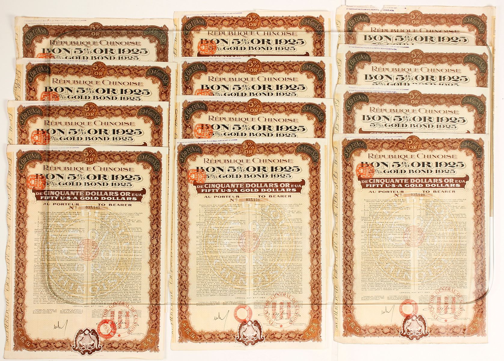 13 Chinese bonds. Republique Chinoise 5% $50 Gold Bond 1925. Most coupons attached. Date: Location: zChina HWAC# 73030