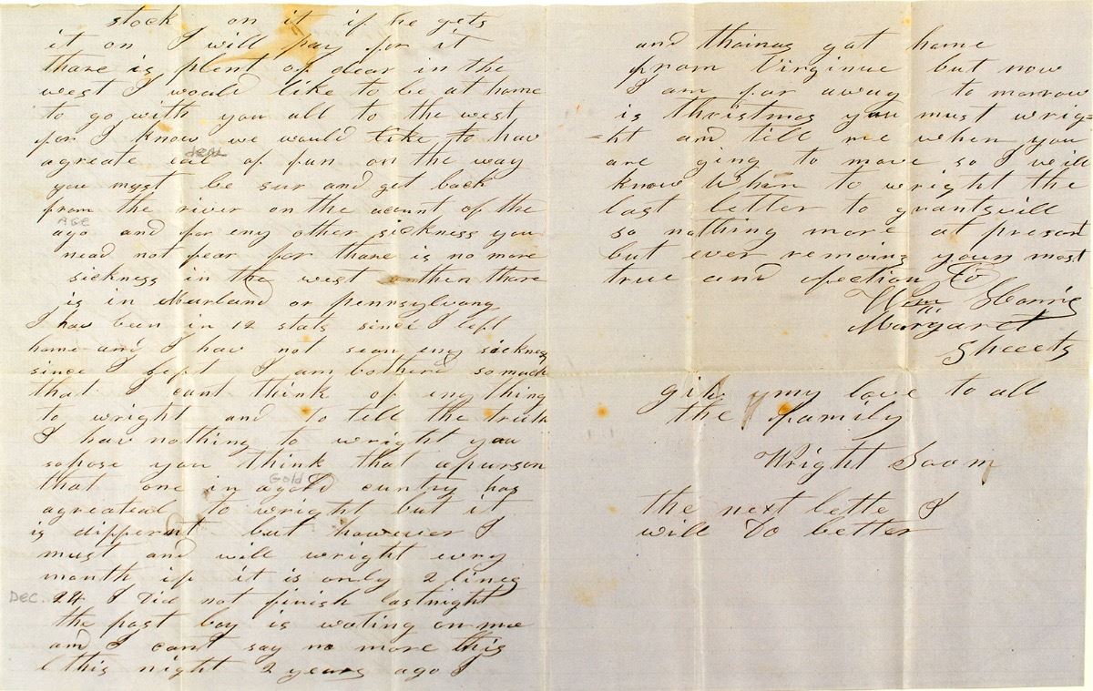 William reports that there is no more sickness in the West than in Maryland or Pennsylvania. Author left home two years ago. Some light staining, easy to read, two small tears at folds. City: French Corral State: California Date: December 23, 1854 hwac# 33390