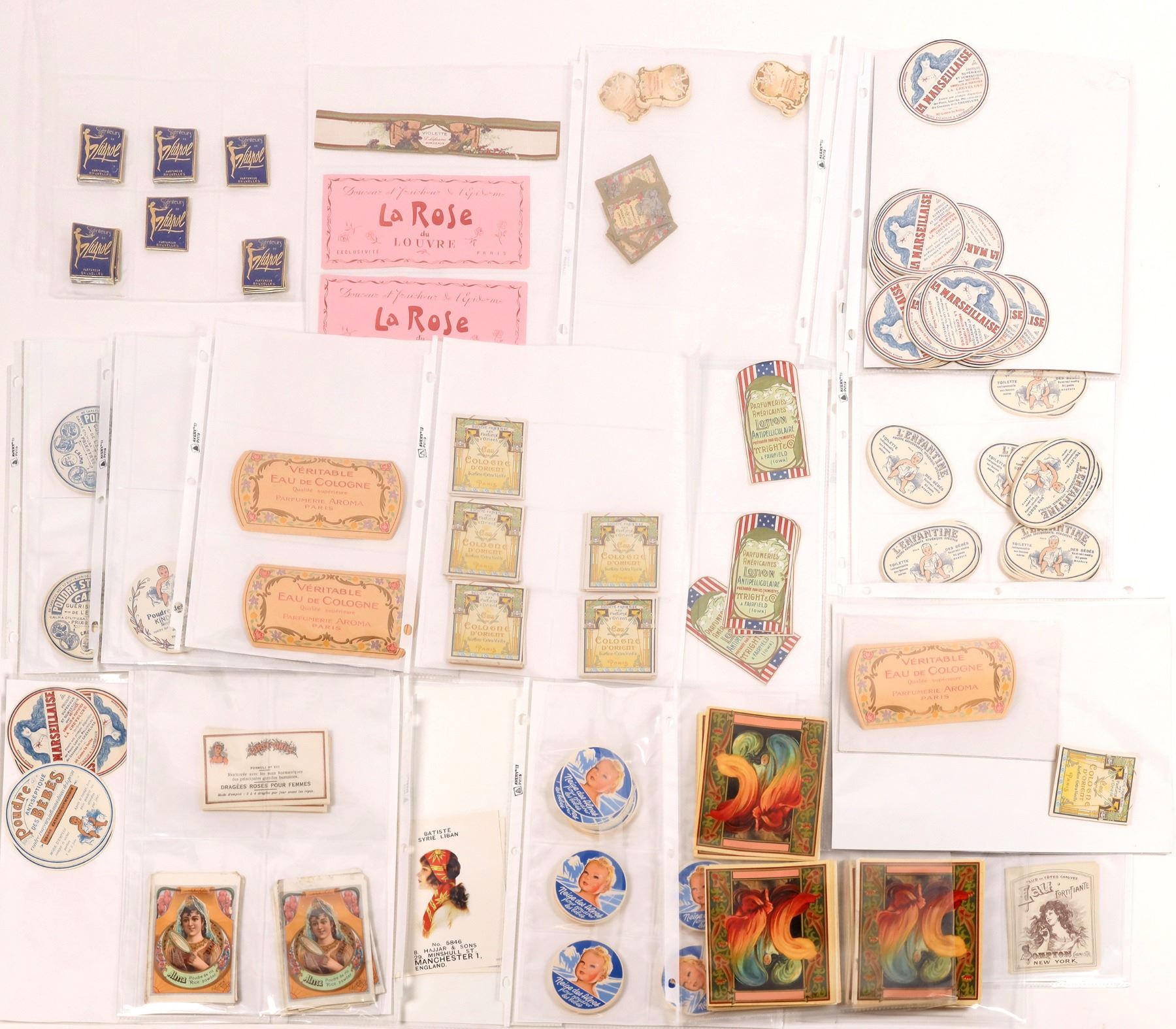 About 500 assorted French drug store and perfume labels in unused condition. Sompton, Bigarade, Les Charmettes, Lady with boas?, Essence de Fleurs, Wright, La Marseillaise, Pourde des Bebes, Tonique Reconstituant, Force Virile, Poudre Insecticide, Neige des Alpes and more.