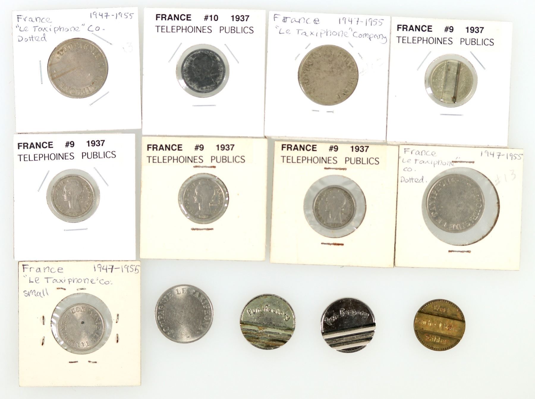 Group of 12 telephone tokens from France and Germany, most mid-1900s. Varying condition, see photos.