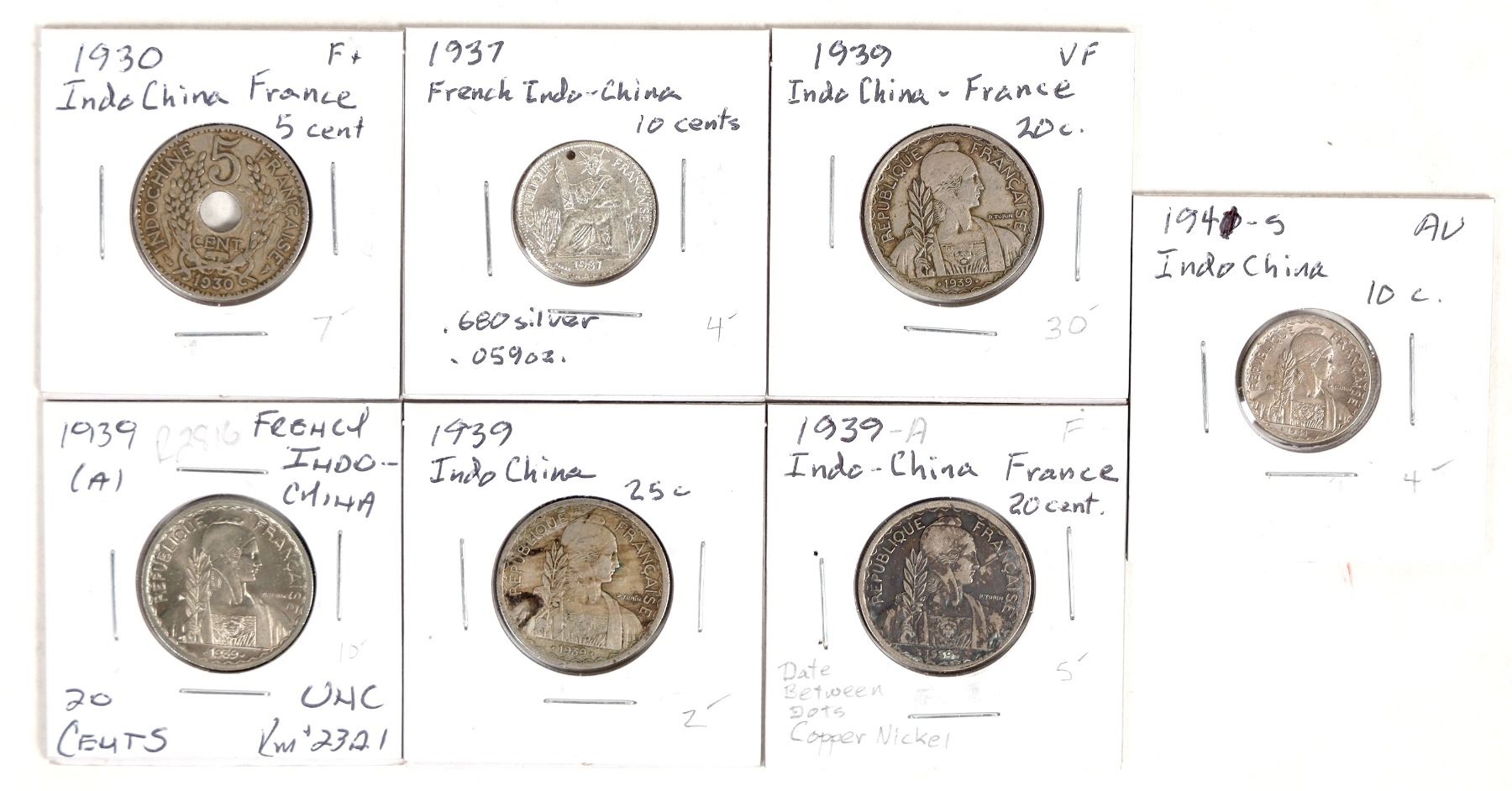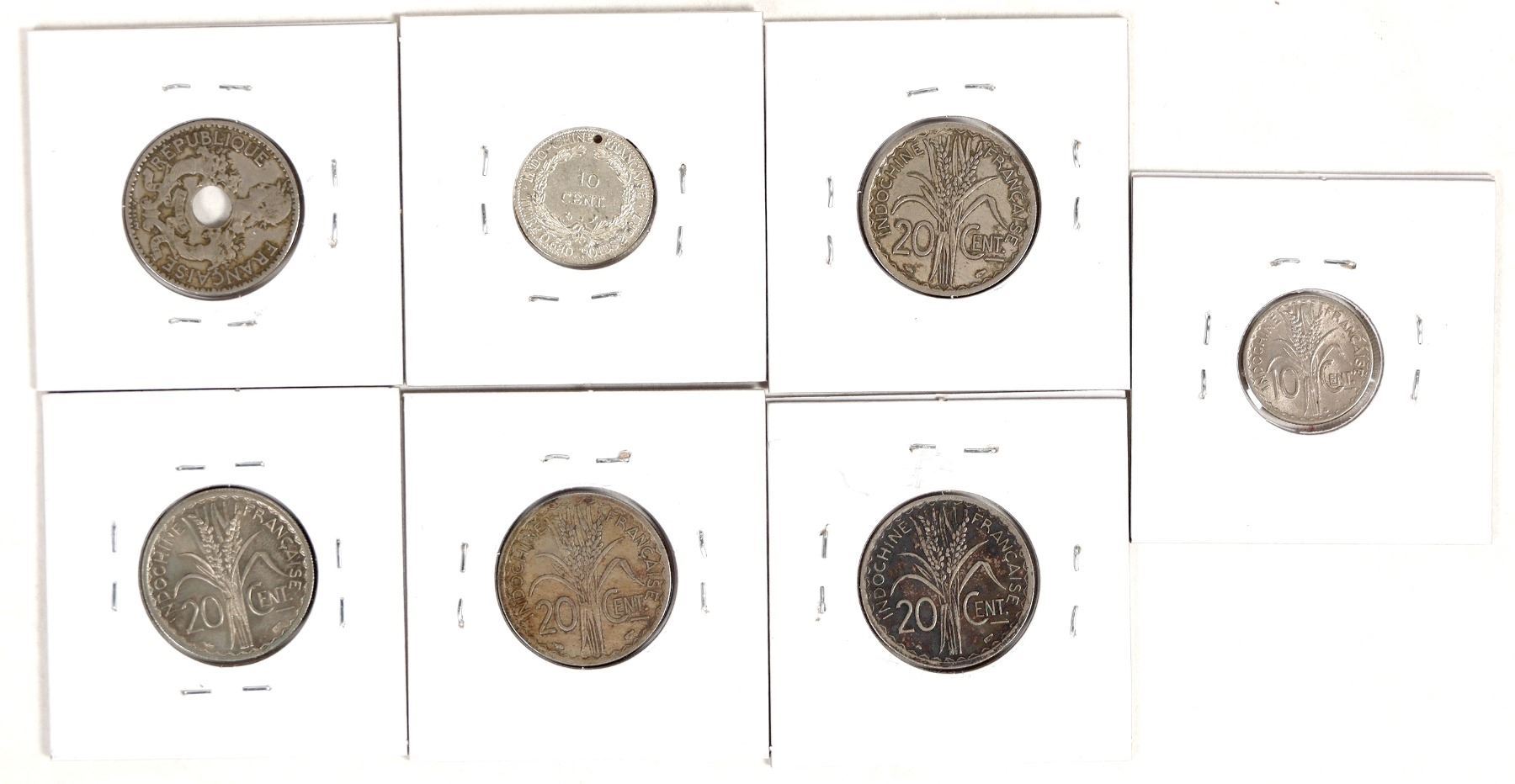Seven coins from French Indo China: 1930 5 cent; 1937 10 cent (holed); 1939 20 cent (4); 1941 10 cent.