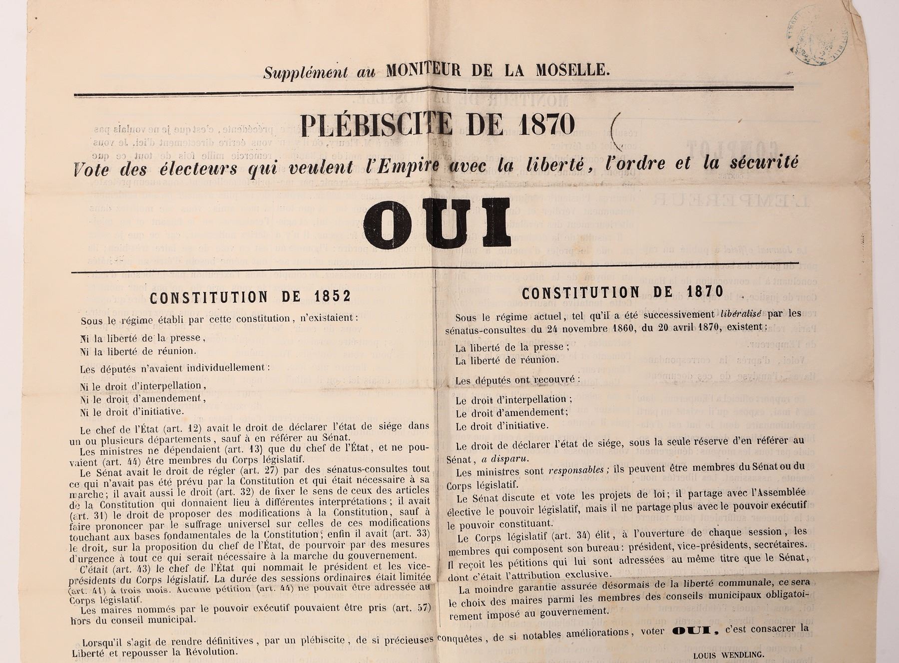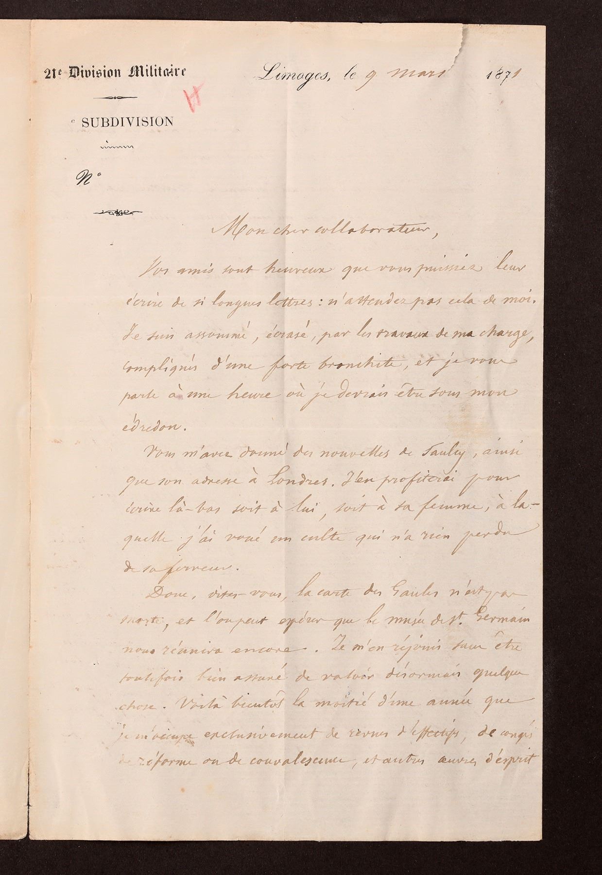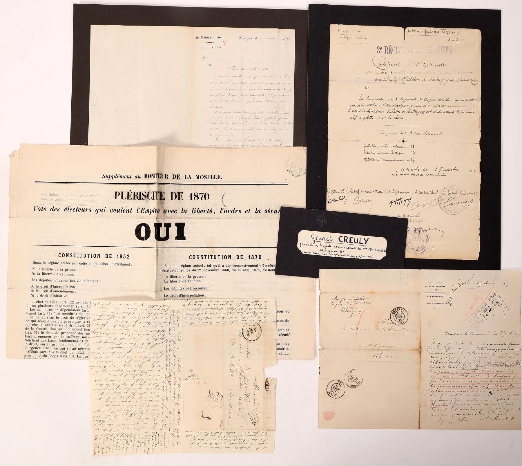 French military documents (5) some related to the Franco-Prussian War. First, there is a letter from General Creuly to a Mr. Barthelemy, offering his opinion on General Chanzy, dated Sept. 24 to Oct1, 1871. Next, an editorial encouraging voters to vote "yes" in the 1870 Moselle Plebiscite. Included, a certificate from the 3rd Regiment of Dragoons, dated Oct.17, 1912. It's stamped and signed. Finally, a hand written letter to the 21st Division, dated March 9, 1871. All are in nice condition. Please see photos for more details.
