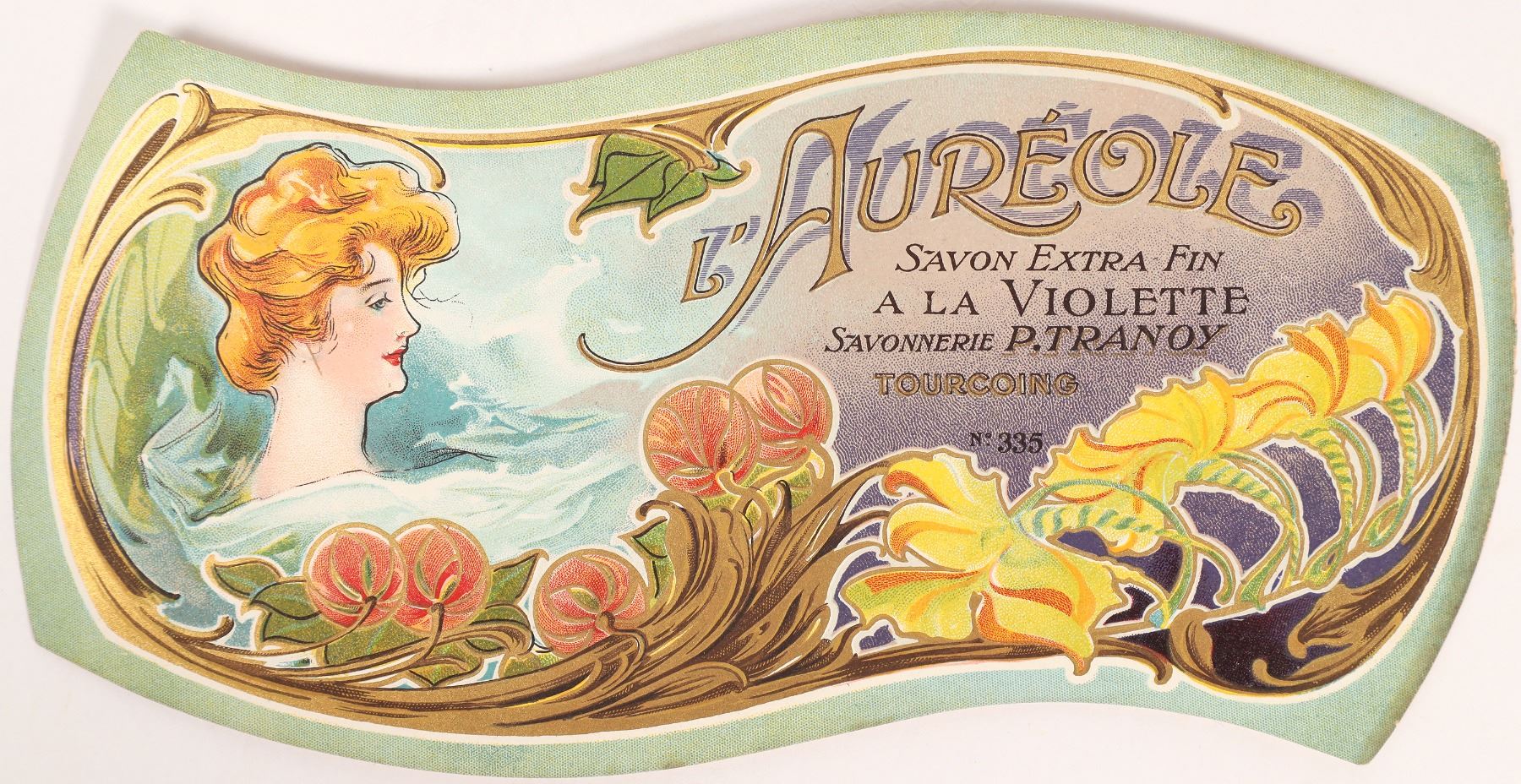 French soap label for L'Aureole Savon Extra Fin a la Violette Savonnerie P. Tranoy. Nice, colorful label with an image of a woman and flowers. Approx. 8.5 x 4.5 inches. Good condition.