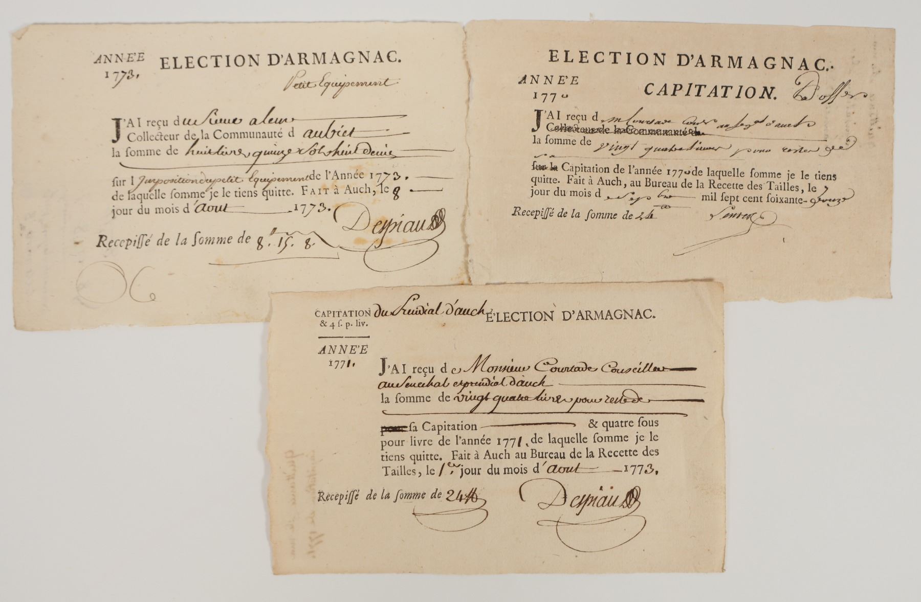 Lot of 3. French Tailles, c1770. Collection of a direst land and personal tax levied against commoners. The tax did not include clergy and nobility. It was very unpopular and evetually led to the French Revolution. EF cond.