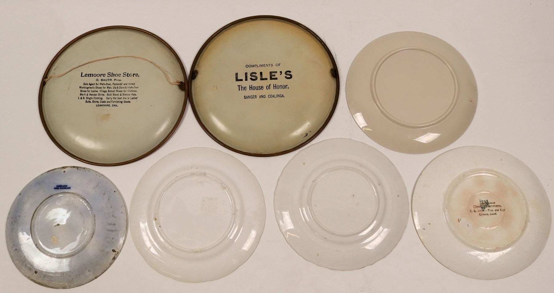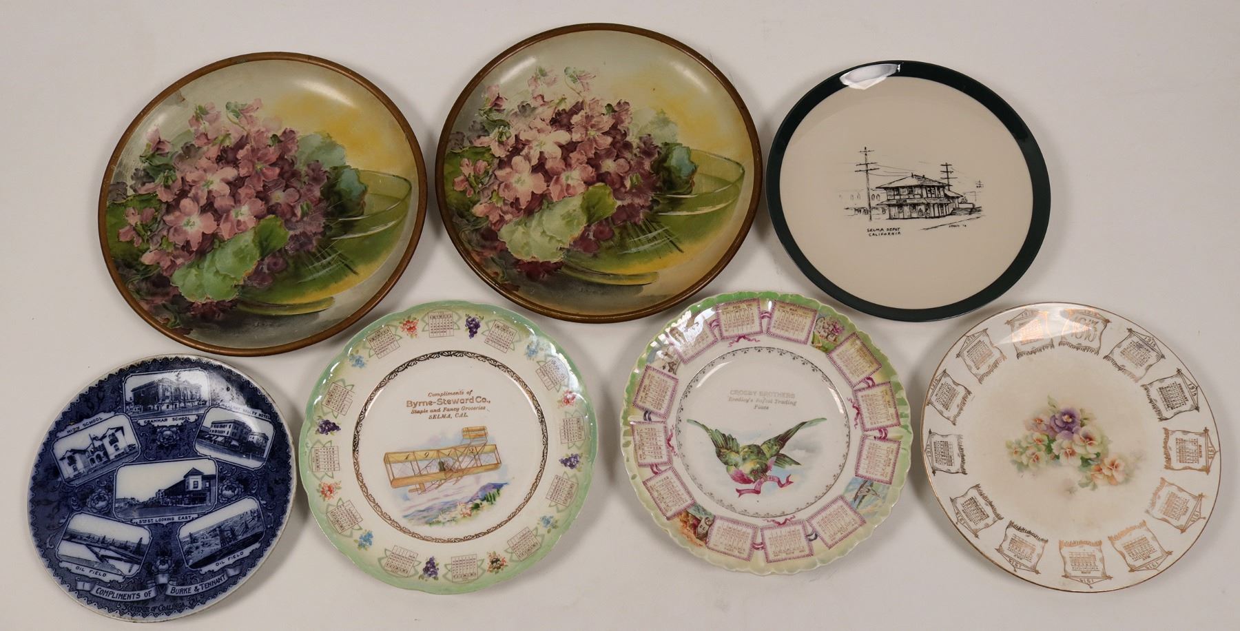 1) complimentary plate of Burke & Tennant of Coalinga. CA, 7-3/4 in. diam. local features; 2) calendar plate dated 1909, 8-in. diam., Fresno, complimentary of Crosby Brothers Reedling's Safest Trading Place; 3) a souvenir plate of Selma Depot, Cal. at 8-1/2 in. diam; 4) calendar plate from Selma at 8-1/2 in. diam., dated 1912 complimentary of Byrne & Stewart Co. groceries depicting an early plane in flight; 5) a calendar plate 8-1/2 in. diam. dated 1913, complimentary of Clovis Pharmacy, Clovis, Cal. C.K. Smith Pres. and Mgr; 6) a complimentary plate of Lemoore shoe store, Lemoore, CA, 8-in. diam., 7) complimentary plate of Lesle's House of Honor, 10-in. diam., Sanger and Coalinga, Ca. 1910-1914.