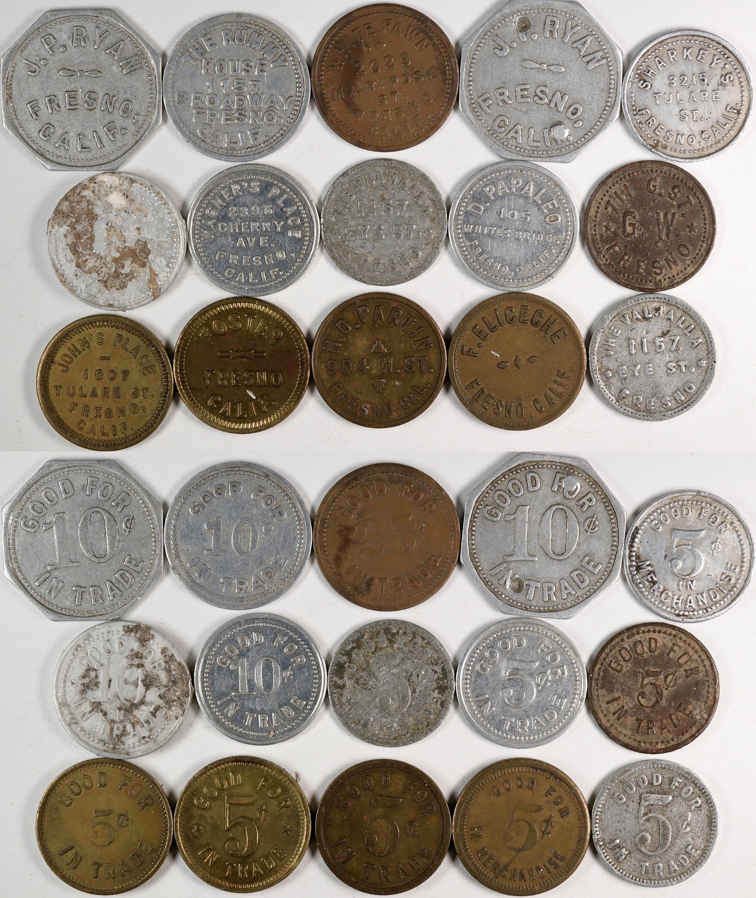 Fifteen tokens: Foster; The Valhalla (2); G.W.; D. Papaleo; Golden Cigar Store; White Fawn; F. Eliceche; The Rummy House; H.O. Partin; Sharkey's; J.P. Ryan (2); John's Place; and Wagner's Place.