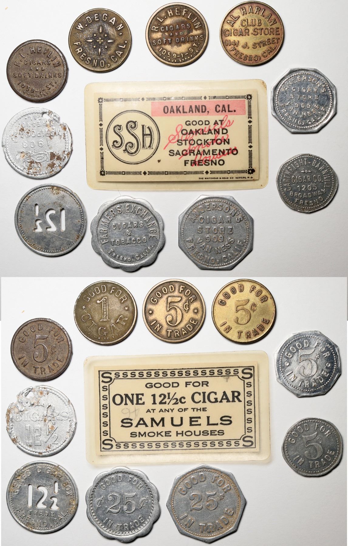 Lot of ten cigar store tokens from Fresno: R. L. Heflin; W. Degan; Anderson Cigar Store; Cartwright & Barnhill;;Gene's Cigar Box; Farmers Exchange Cigars; Al Harlan; Samuels Smoke House.