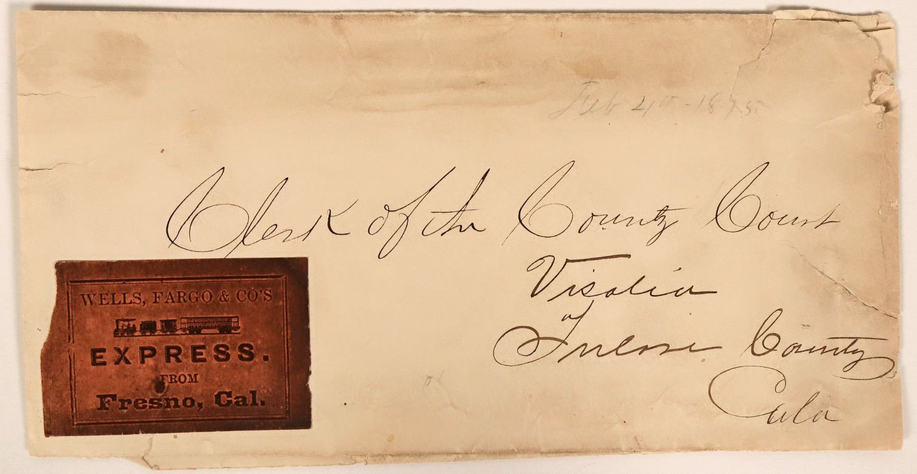 Wells Fargo Express stamped cover, not through regular mail. Was most likely carried and delivered via stagecoach. It is in decent condition for its age, with a few nicks and tears. Addressed to Visalia in Fresno County. Handwritten 1875 date.