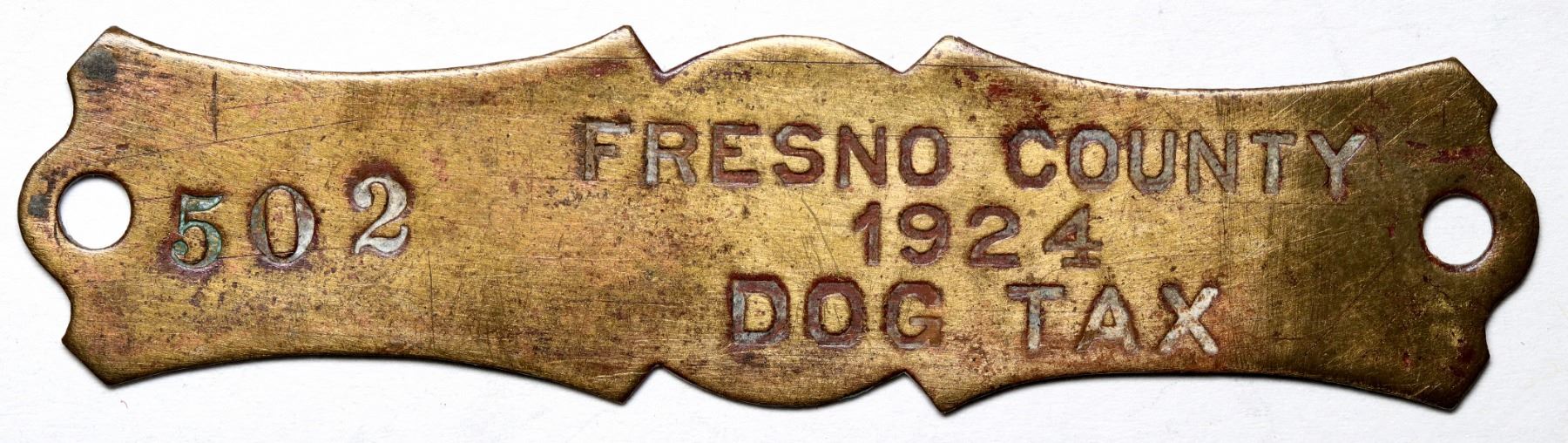 Brass, 67 x 14 mm, #502 / Fresno County / 1924 / Dog Tax.