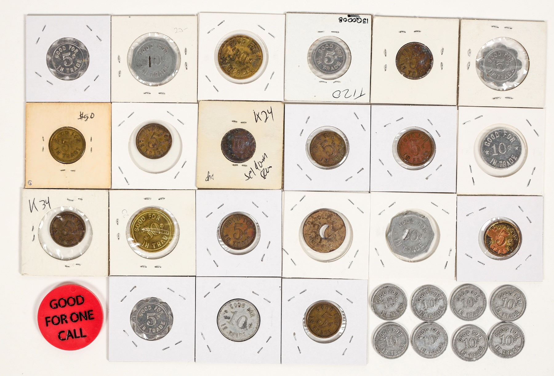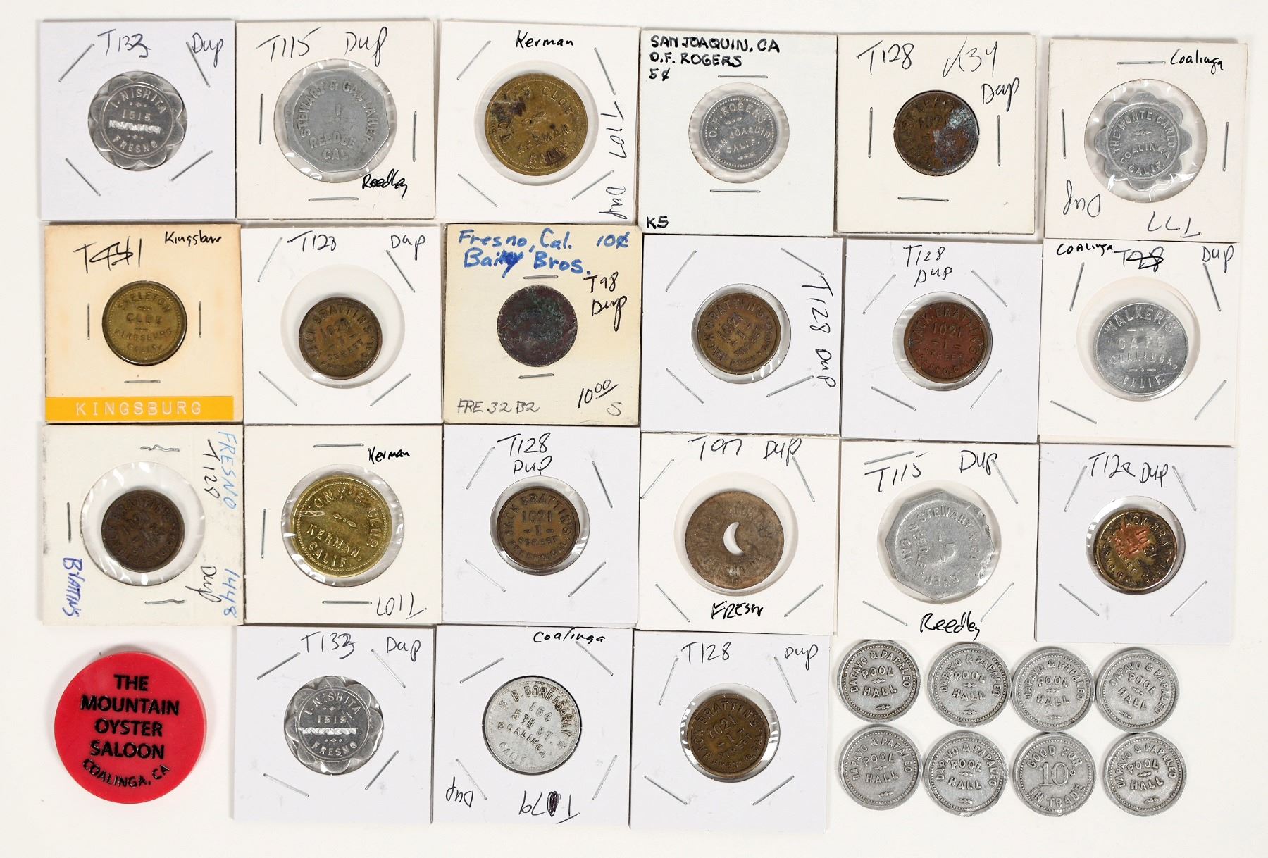 Thirty tokens from Fresno County: Coalinga, Reedley, Kerman, Kingsburg, San Joaquin, Fresno. Mountain Oyster Saloon; Dapavo & Papaleo Pool Hall; Skeleton Club; Tommy's Club and many more.