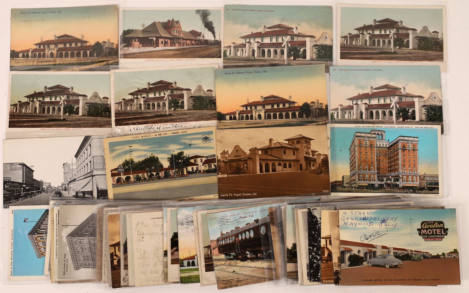 A nice collection of primarily color postcards of various buildings and railroad depots in Fresno. Included are cards featuring the interior of the New Sequoia Hotel, The SP Depot, The Santa Fe Depot, Hotel Californian, The City Motel and many more. Some are used, some are blank. Please see photos for more detail and condition. Date: 1906-1950's Country (if not USA): State: California City: Fresno Provenance: