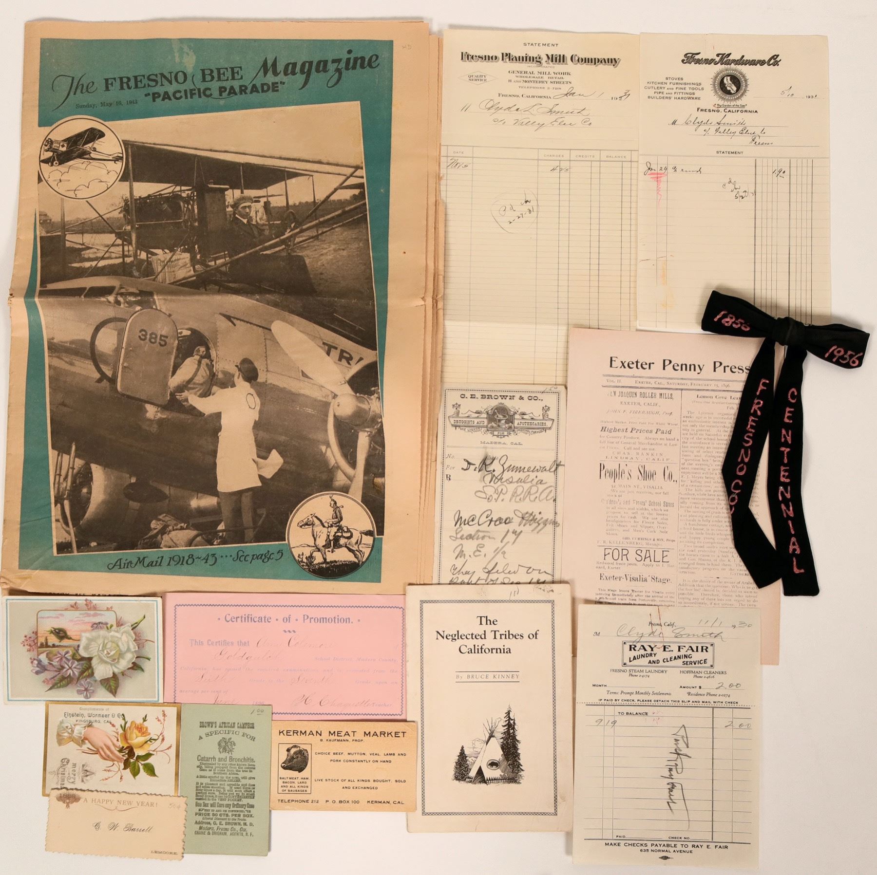 Lot of 15 various items, several from the 1800s, from the Fresno-Madera, Calif., area. Includes several receipts, with one from C.E. Brown, M.D., c1880s, C.E. Brown & Co., Druggists and Apothecaries, an 1888 Happy New Year visiting card for C.W. Barrett, June 1896 promotion certificate for Amy Colemore, from sixth to seventh grade at Goldgulch School District, Madera County, 1896 Exeter Penny Press, more very old business cards, booklets, more receipts and a 1943 Fresno Bee that celebrates the 50 year anniversary of Madera County, a special magazine. See photo for more details.