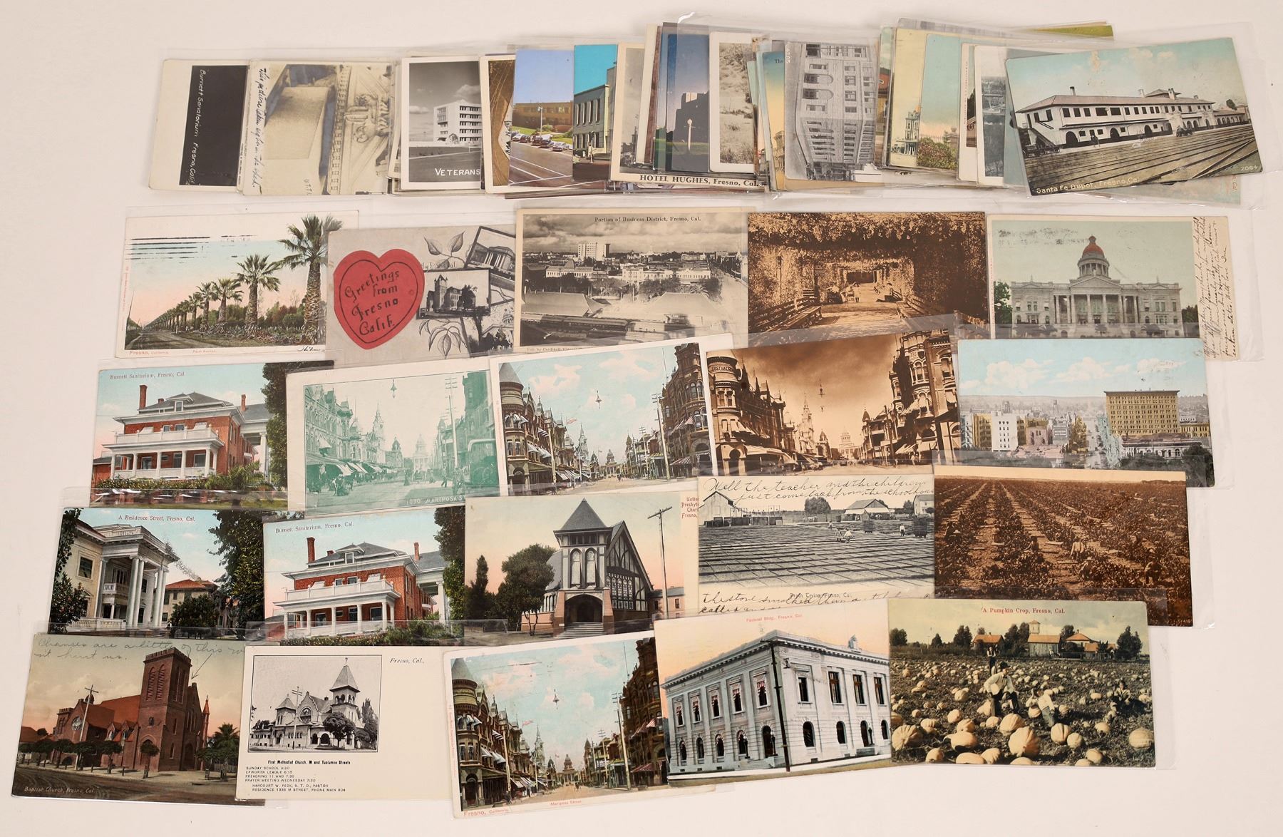 This a collection of 77 RPC's and Mitchell style postcards. highlighting the Central California town of Fresno. Included are about a dozen black & white RPC's (1905-1910) with the rest being colored painted or photo images.