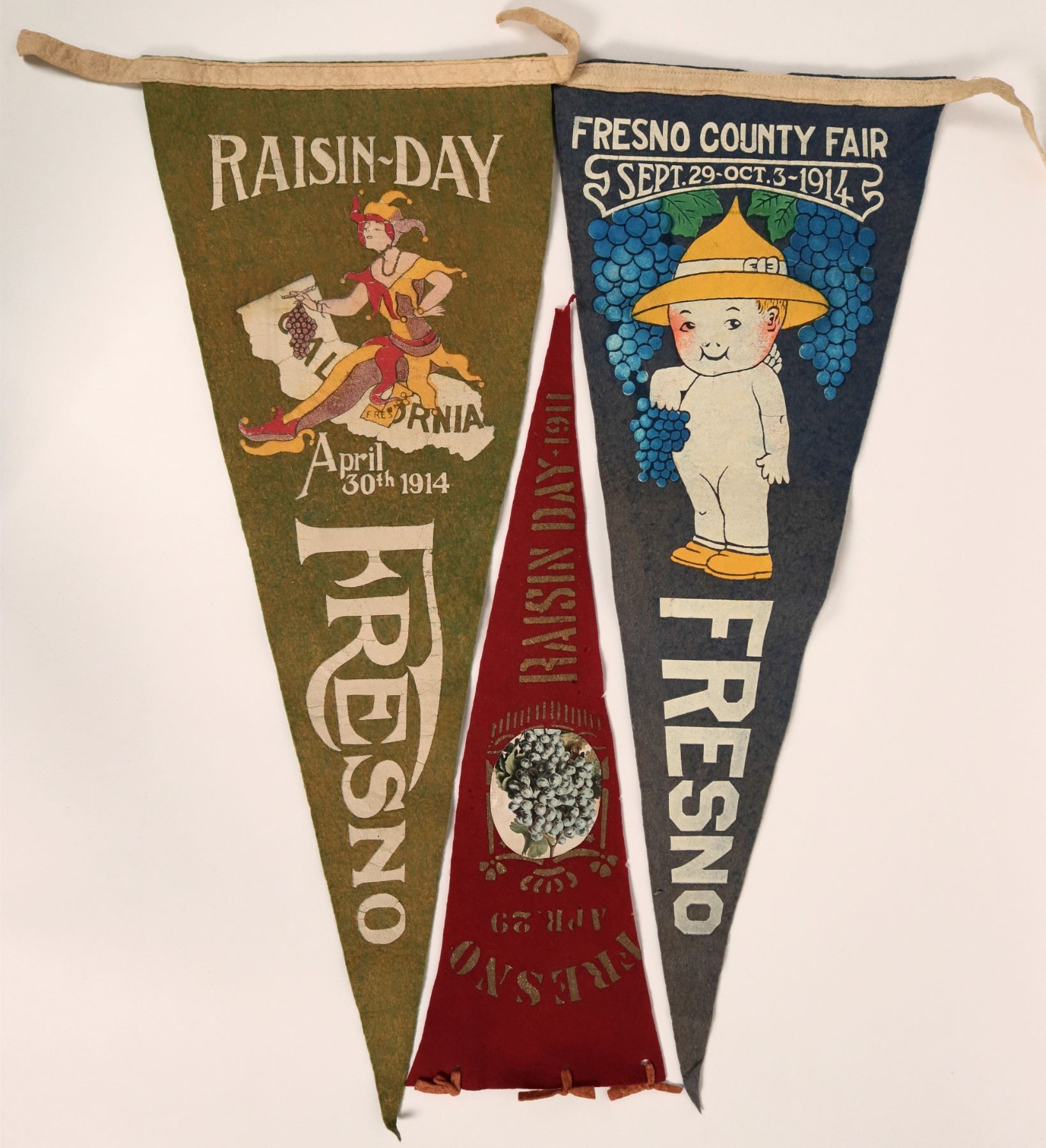 Three pennants commemorating Fresno's Raisin Day celebrations of 1911 and 1914.Larger items measure 27", while the smaller one checks in at 21". In good condition with some age wear,