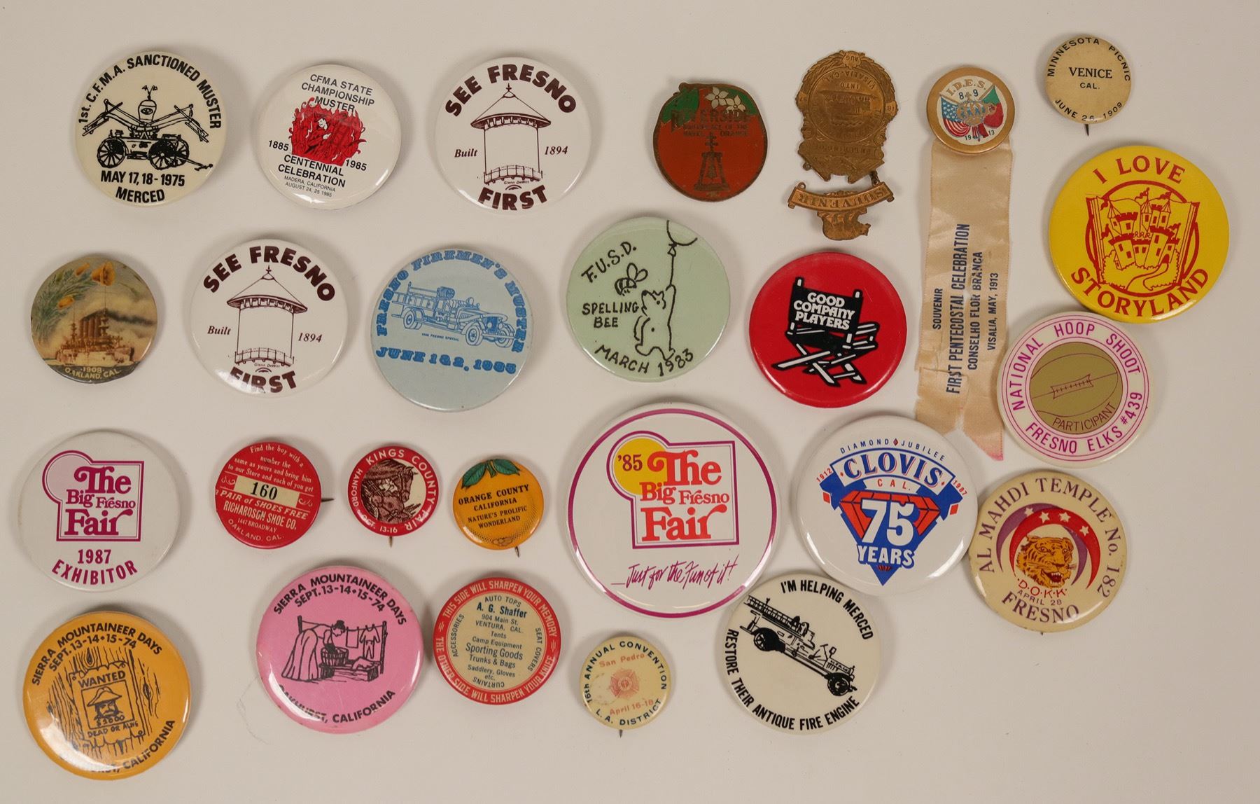 Group of 26 pinbacks from the Fresno-Southern California area, c1897-1987. Includes the "Entering of the Valley Railroad into Visalia," 1897, "First Pentacostal Celebration," Visalia, Calif., 1913, on up to Fresno Fair "Exhibitor" 1987.