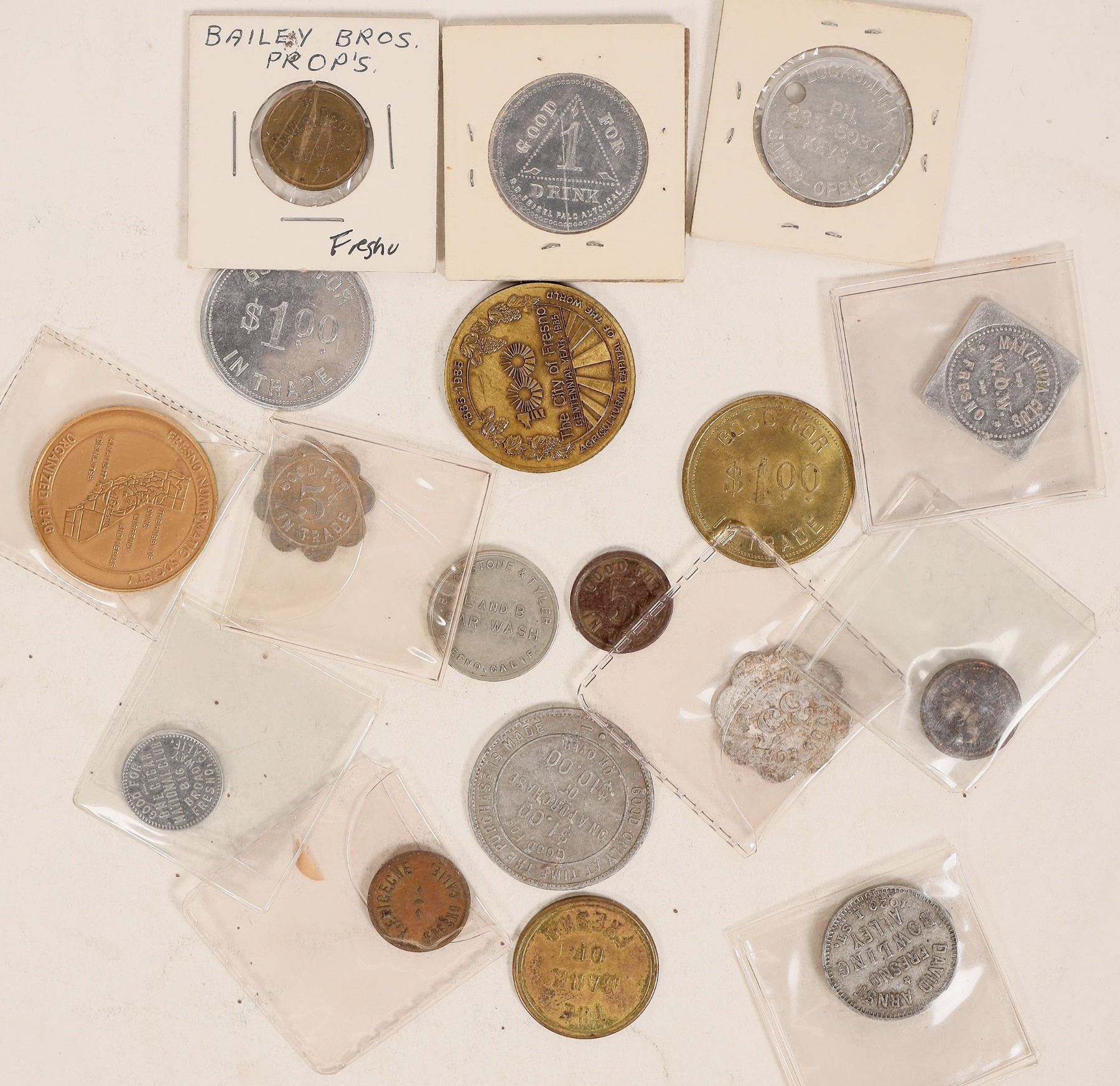 Lot of 18 tokens from Fresno: Bratlins; Shamlin; Papaleo; Nishita; Eliche; Bailey Bros. and more. [Fresno] [California]