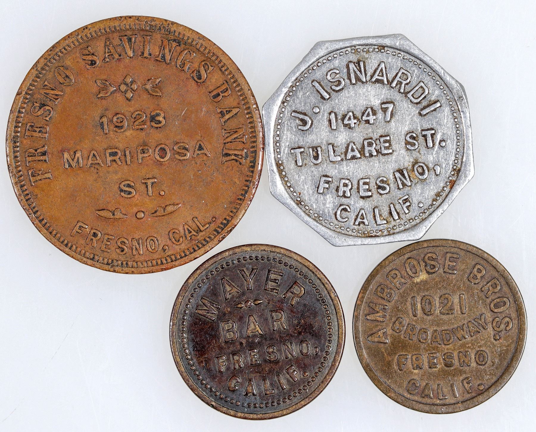 4 Fresno tokens. Ambros Bros., Fresno Savings, Mayer Bar, J Isnard. Fresno California