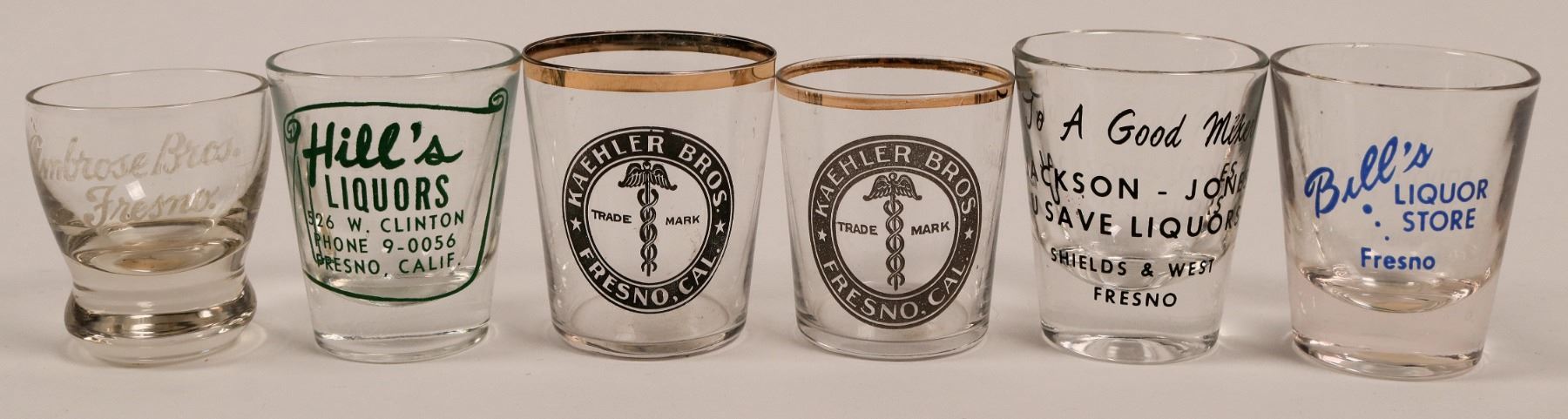 Two vintage shot glasses: Kaehler Bros (2); BiThe following in silk screen: Bills Liquor store; Hills Liquors; Abros Bros,; Jackson Jones Liquors