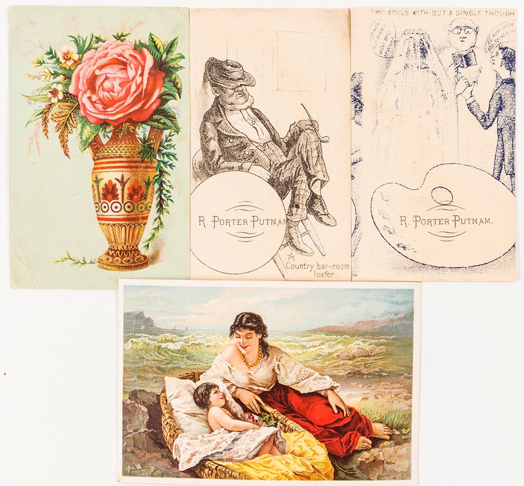 4 trade cards from Fresno and Porterville CA, 3 have rear staining. Date: c. 1880-1890 Location: Fresno, California HWAC # 54139