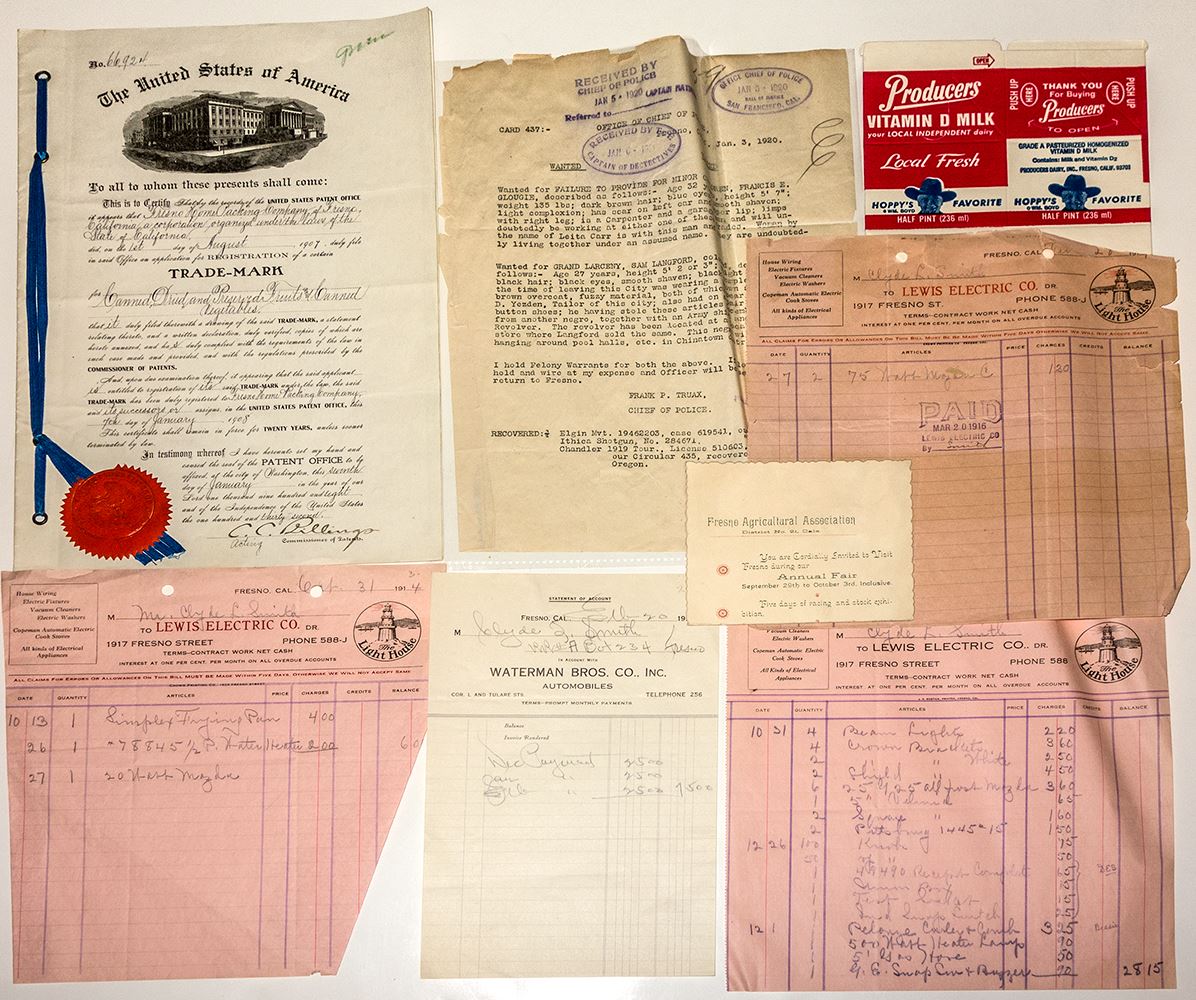 Eight pieces of Fresno history: Producers Dairy container, Waterman Bros. automobiles, Lewis Electric Co. 1920 police report