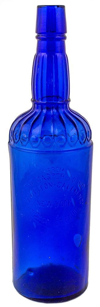 From The Caspers Co. Inc. Winston-Salem, North Carolina, New York, Chicago, St. Louis. Embossing in circular slug plate. Fluted shoulder cobalt whiskey. Extremely rare, companion to "The Honest North Carolina" piece. One of the three different Casper whiskeys in this sale. Tiny little chip at right. Otherwise bright and vibrant. City: State: North Carolina Inventory Number: 39506